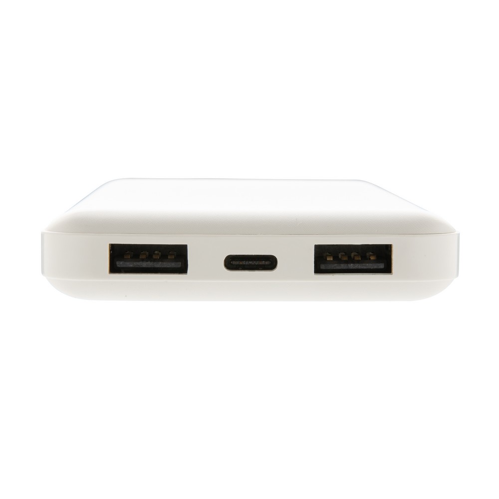 Power bank 10000 mAh, 2 wyjścia USB do ładowania 2 urządzeń jednocześnie, 4 diody wskazujące poziom naładowania, kieszonkowy rozmiar, wykonany z lekkiego ABS, wbudowany akumulator litowo-polimerowy klasy A o dużej gęstości i trwałości, w pełni naładowane urządzenie może naładować telefon do 5 razy, wejście 5V/2A, wyjście USB 1 5V/2A, wyjście USB 2 5V/1A, kabel micro USB w komplecie, ślad węglowy produktu: 4,11 kg CO2