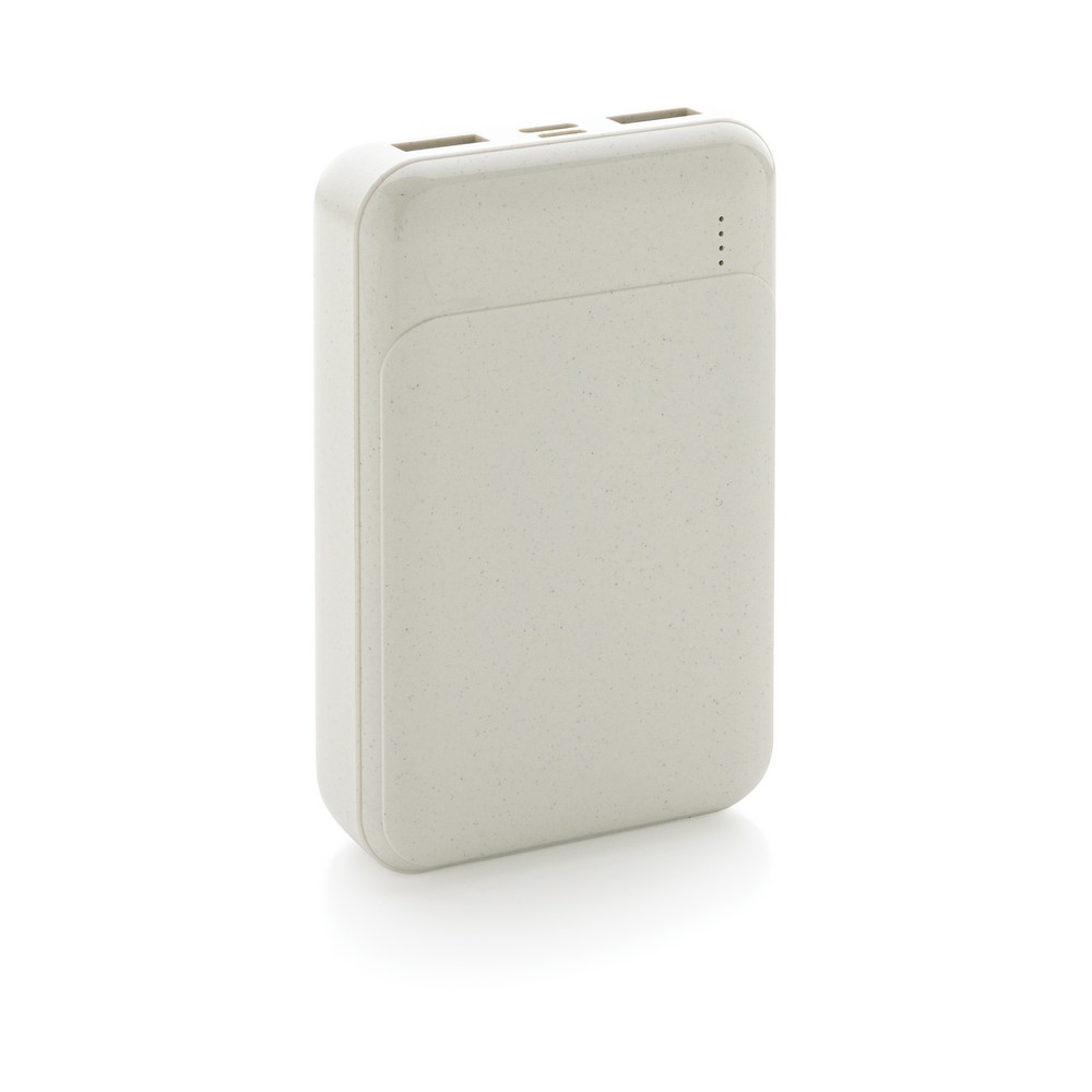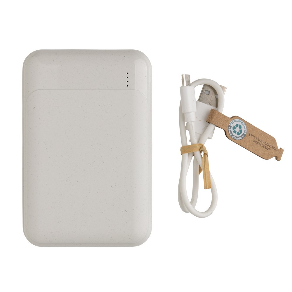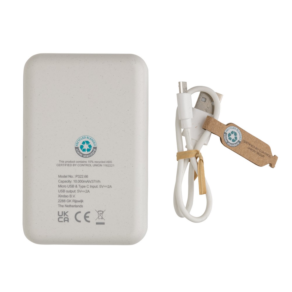 Power bank 10000 mAh, w pełni naładowany, wbudowany akumulator litowo polimerowy klasy A pozwala na naładowanie telefonu do 5 razy, obudowa wykonana z ABS pochodzącego z recyklingu, posiadają certyfikat RCS (Recycled Claim Standard), który jest stosowany gdy produkt jest wykonany częściowo lub w całości z materiałów pochodzących z recyklingu, wejście typu C 5V/2A, wejście micro USB 5V/2A, wyjście USB 5V/2A, kabel z TPE z recyklingu w komplecie, nie zawiera PVC, ślad węglowy produktu: 3,64 kg CO2