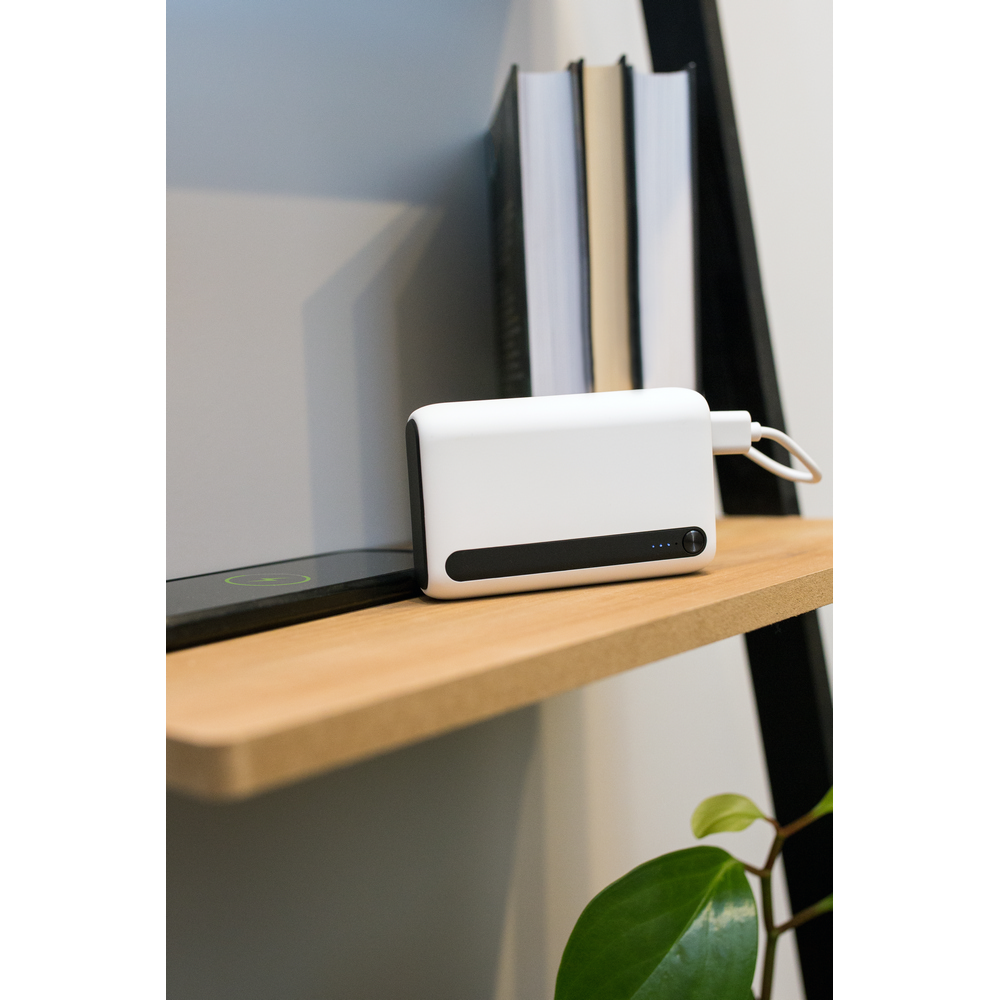 Power bank 10000 mAh, 4 diody wskazujące poziom naładowania, gumowana obudowa, wejście micro USB oraz USB-C (18W), 2 wyjścia USB (18W), wyjście USB-C (20W), możliwość ładowania trzech urządzeń jednocześnie, kabel USB-C w komplecie