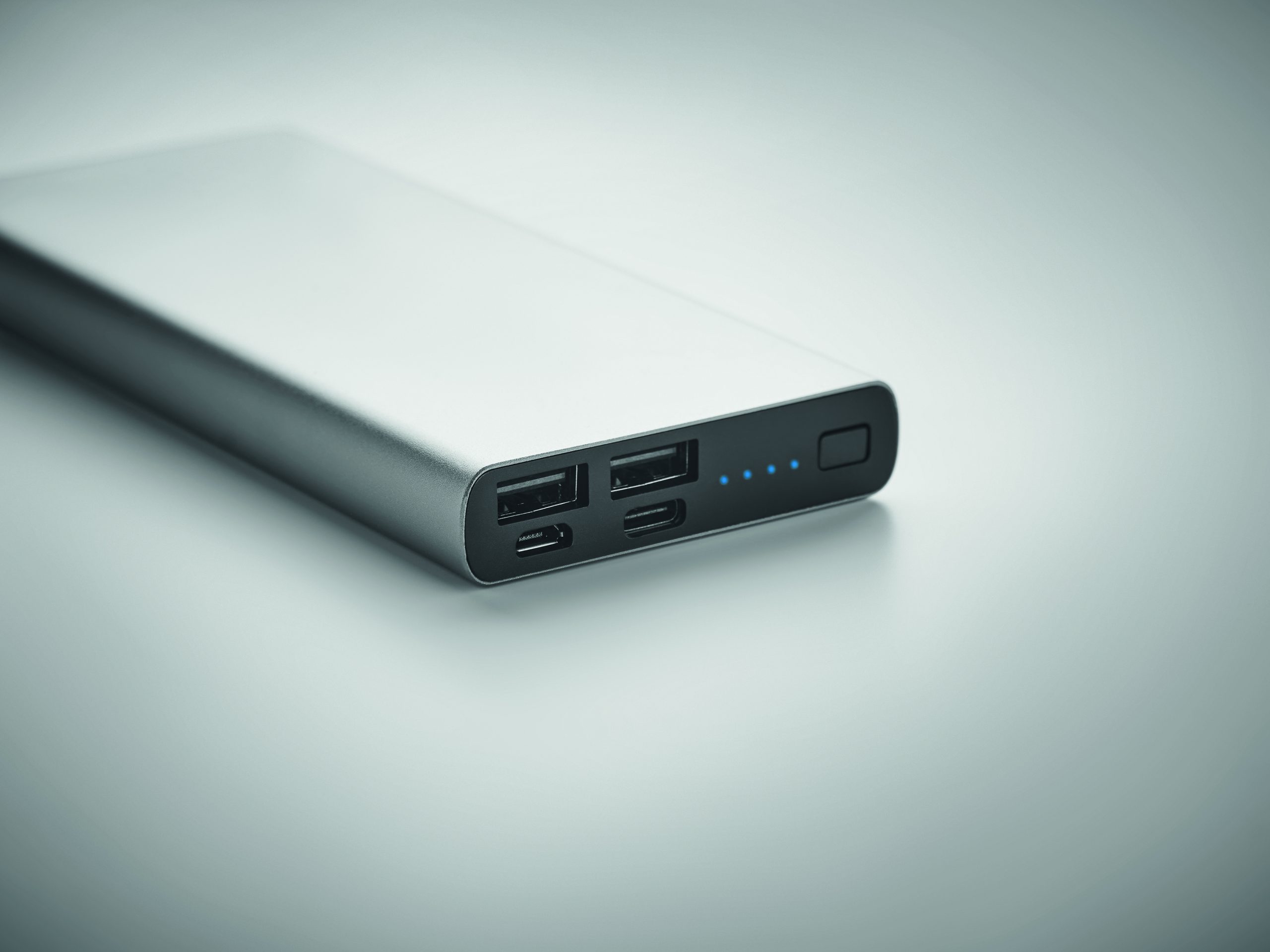 Power bank 10000 mAh z aluminium pochodzącego z recyklingu. Pojemność do smartfonów, prąd wyjściowy DC5V/1A i DC5V/2A. Zawiera lampkę kontrolną i kabel USB z wtyczką micro USB. Obsługuje technologię szybkiego ładowania (18 W). Wejście/wyjście: Typ-C. Obsługa Power Delivery (PD) do ładowania najnowszego laptopa MacPro®.