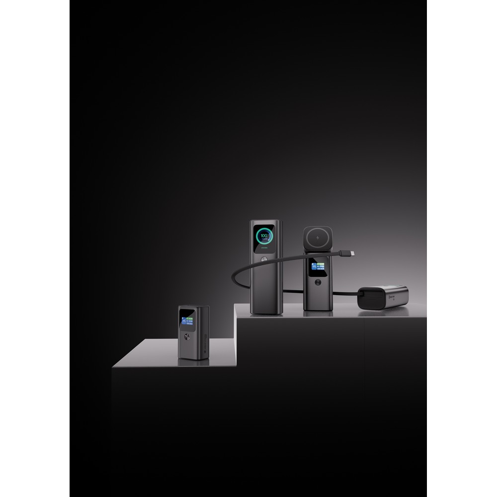 Power bank 10000 mAh, posiada kolorowy wyświetlacz TFT pokazujący poziom naładowania, prędkość ładowania, ilość cykli ładowania, stoper, moc ładowania do 55W, trzy porty wyjściowe, 2 x USB-C i USB-A, wykonany z aluminium z recyklingu
