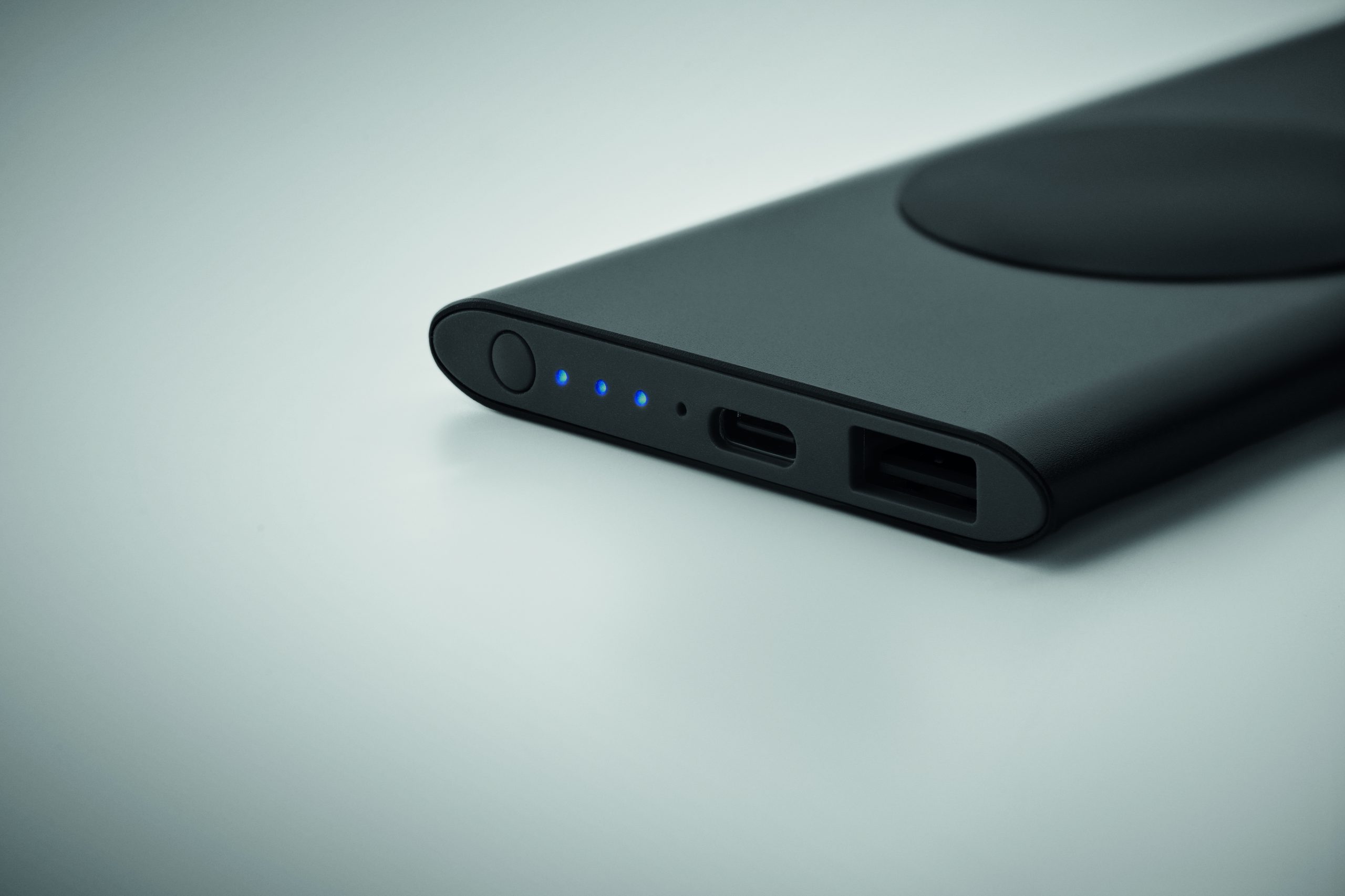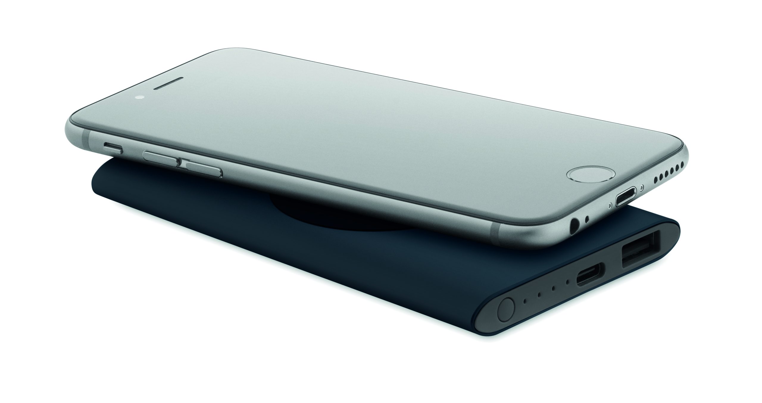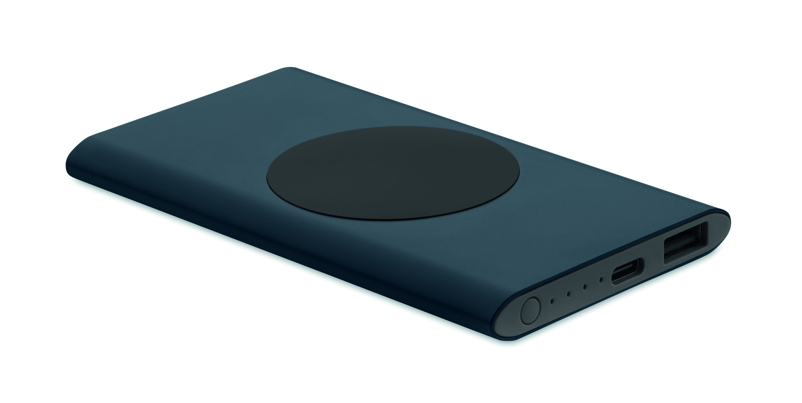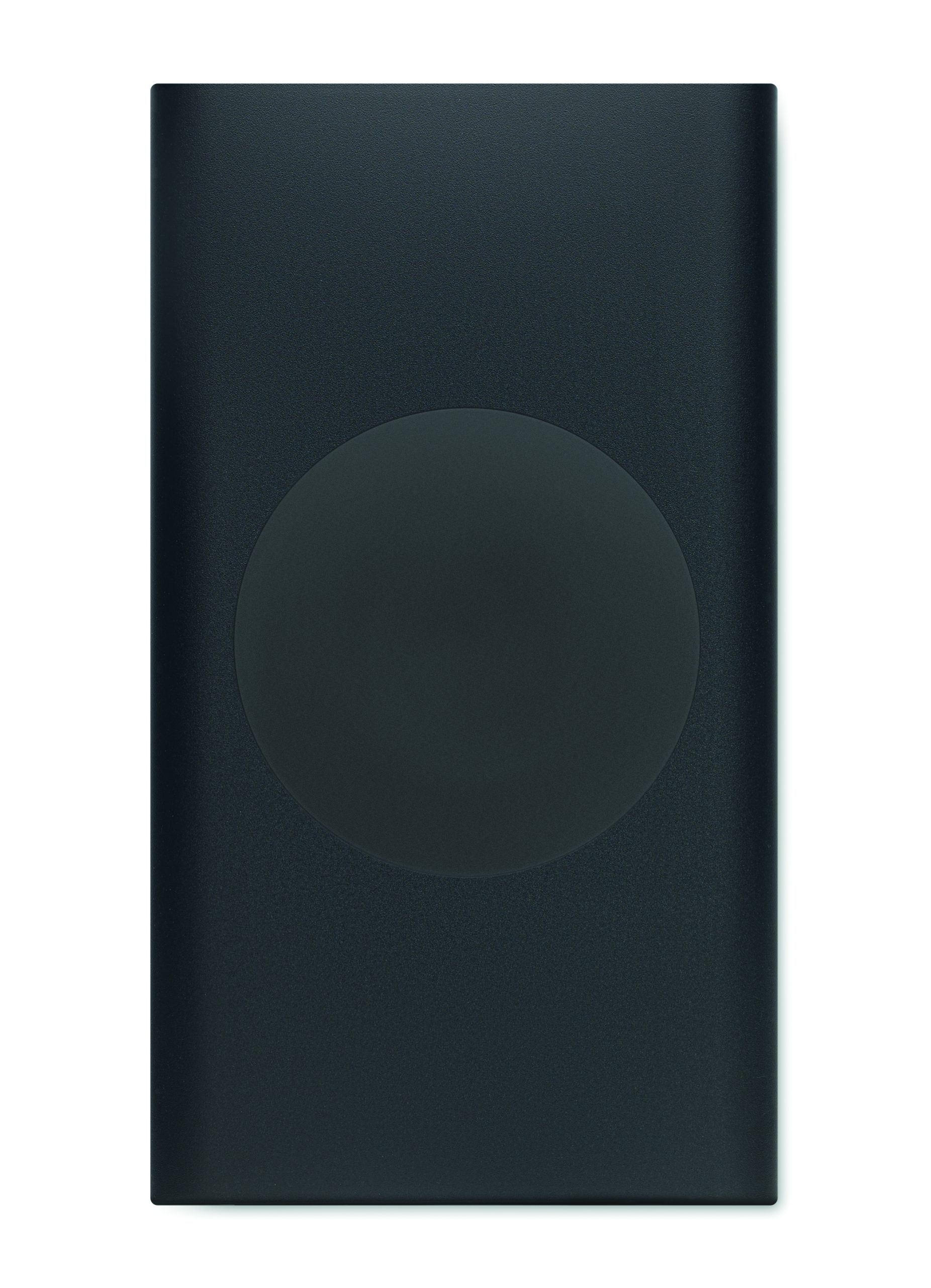 Bezprzewodowy power bank o mocy 15 W i pojemności 5000 mAh wykonany z aluminium pochodzącego z recyklingu. Wejście: Typ-C. Wyjście: 1 x Type-C i 1 x Type-A.