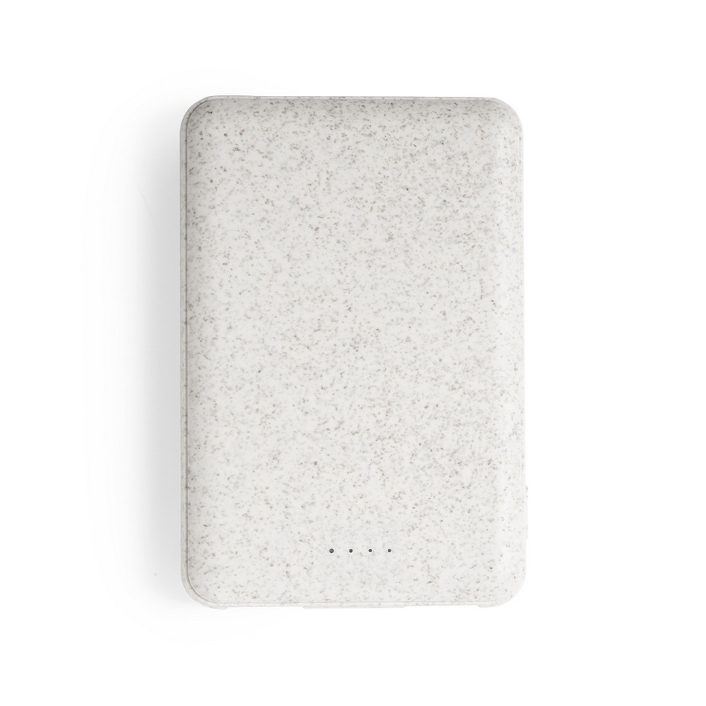 Power bank 5000 mAh z włókien słomy pszenicznej, 4 diody wskazujące poziom naładowania, możliwość ładowania dwóch urządzeń jednocześnie, 2 wyjścia USB 5V/2A, wejście micro USB 5V/2A, kabel micro USB w komplecie