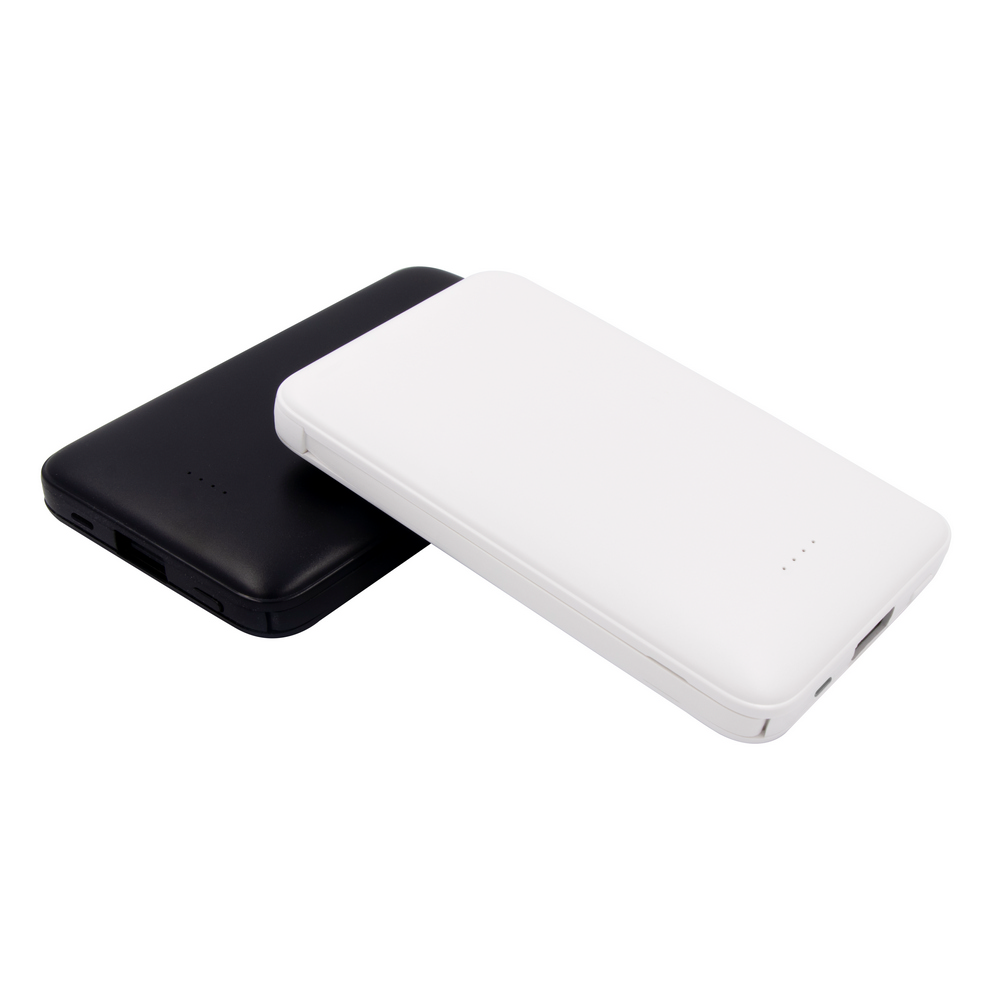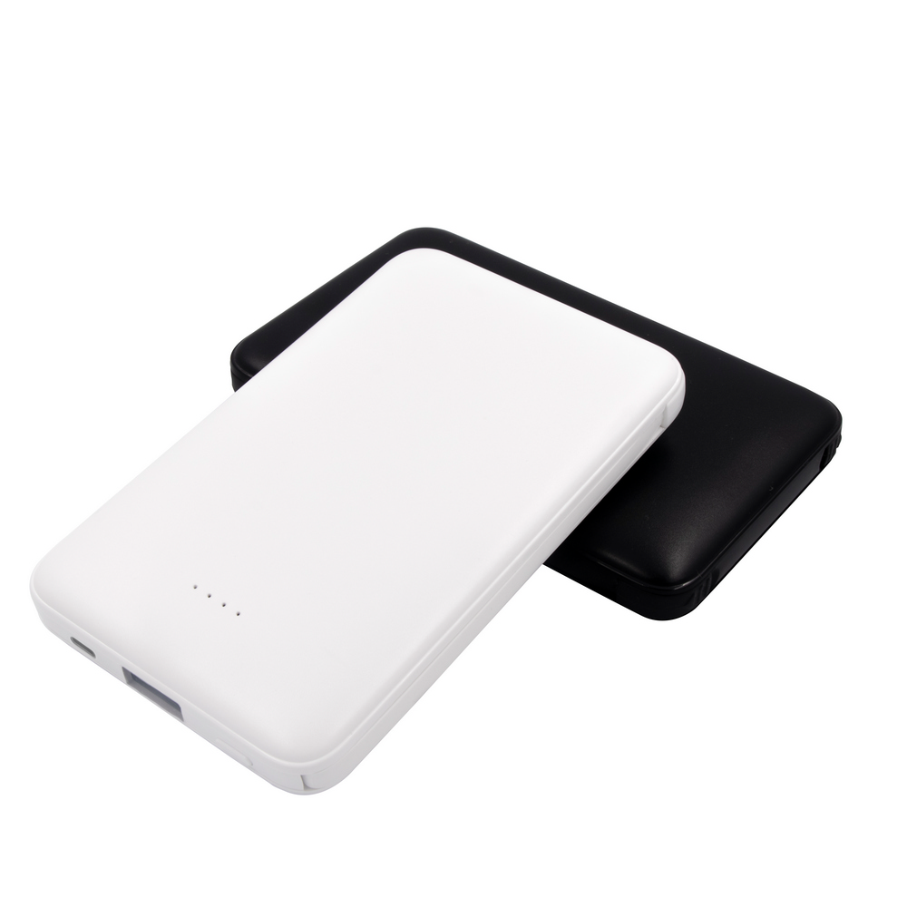 Power bank 5000 mAh z 2 zintegrowanymi kablami: USB-C oraz micro USB, w komplecie adapter z wejściem micro USB i końcówką kompatybilną z urządzeniami iOS, 4 diody wskazujące poziom naładowania, wejście USB-C, kabel USB-C w komplecie
