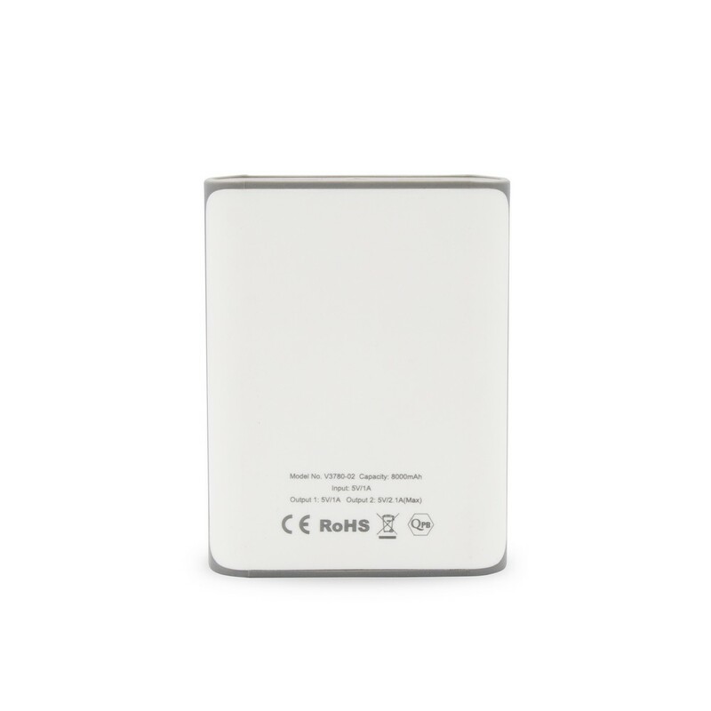 Power bank 8000 mAh, wyjścia 5V/2.1A oraz 5V/1A, wejście 5V/1A, 5 diod wskazujących poziom naładowania, lampka LED, w komplecie kabel micro USB
