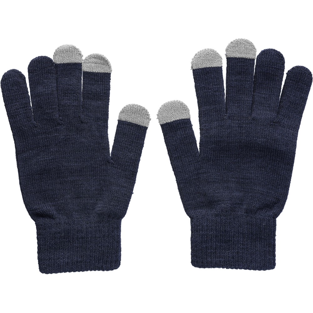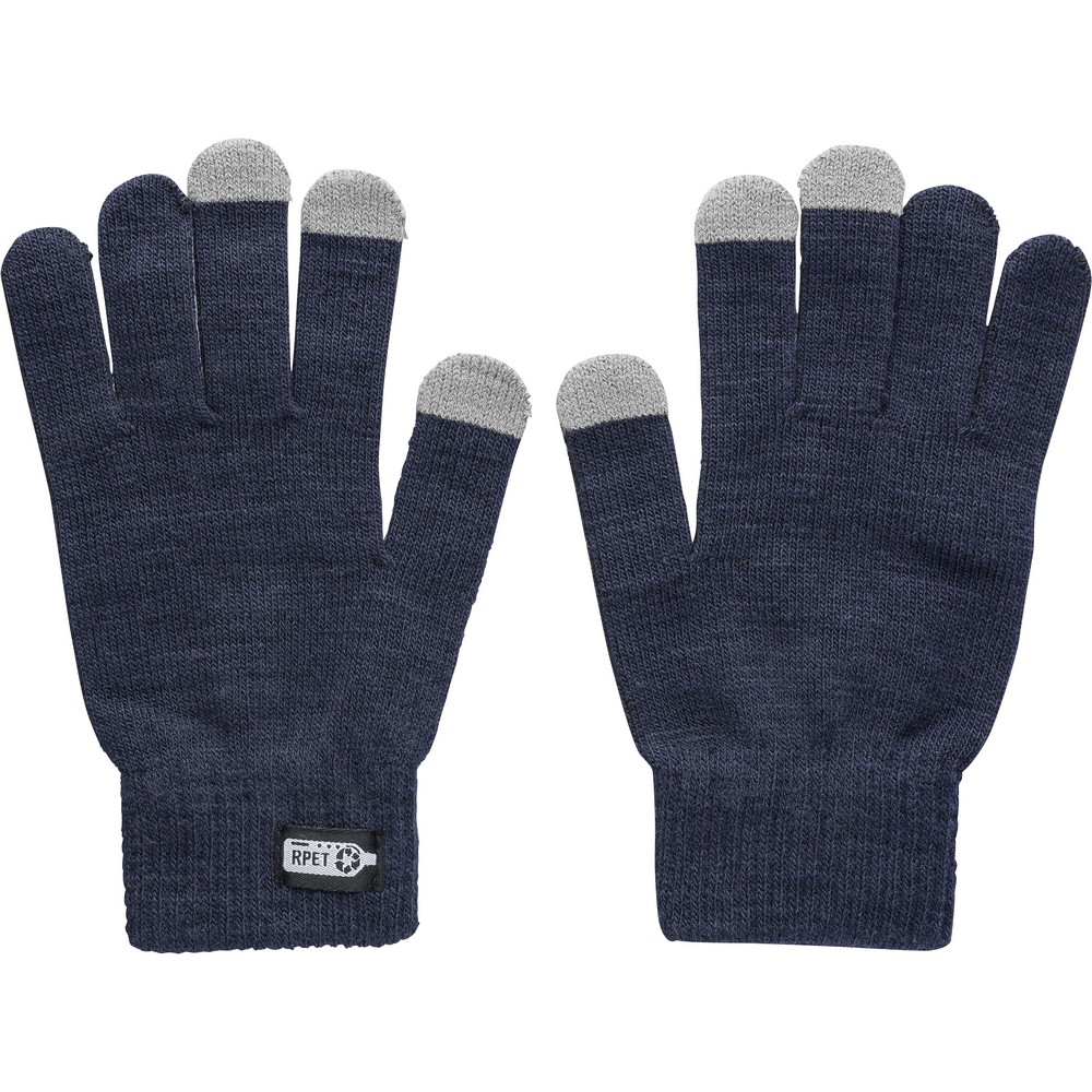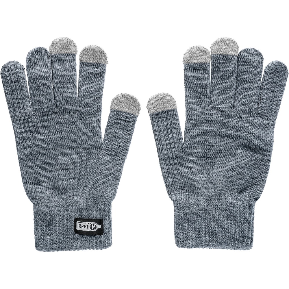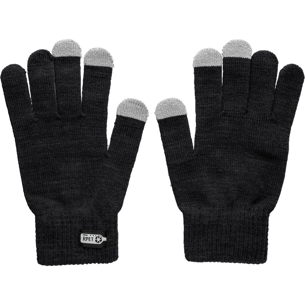 Rękawiczki z 3 specjalnymi końcówkami umożliwiającymi obsługę ekranów dotykowych, etykieta RPET z zewnątrz, etykieta informująca o praniu wewnątrz, produkt wykonany z RPET i elastanu