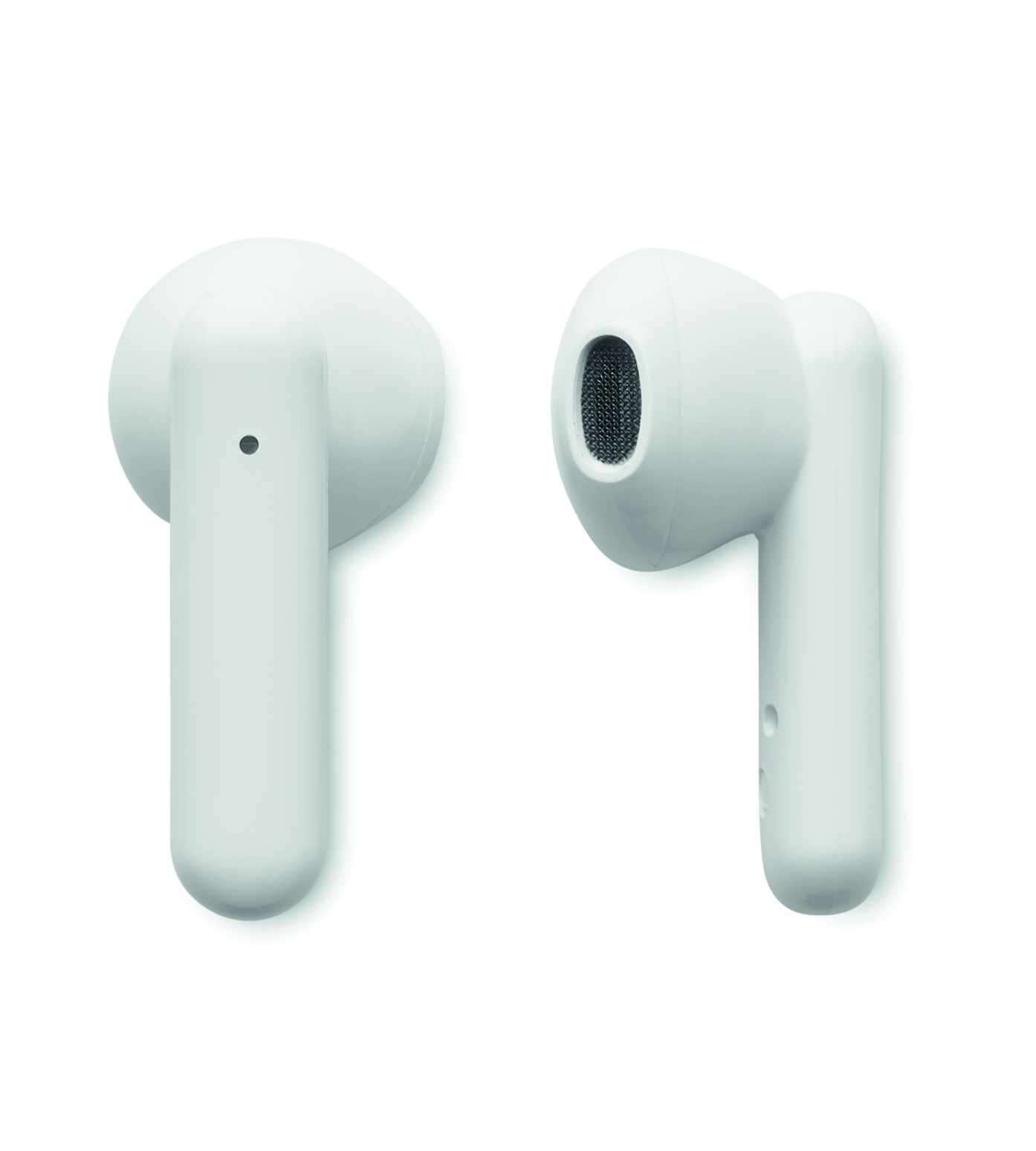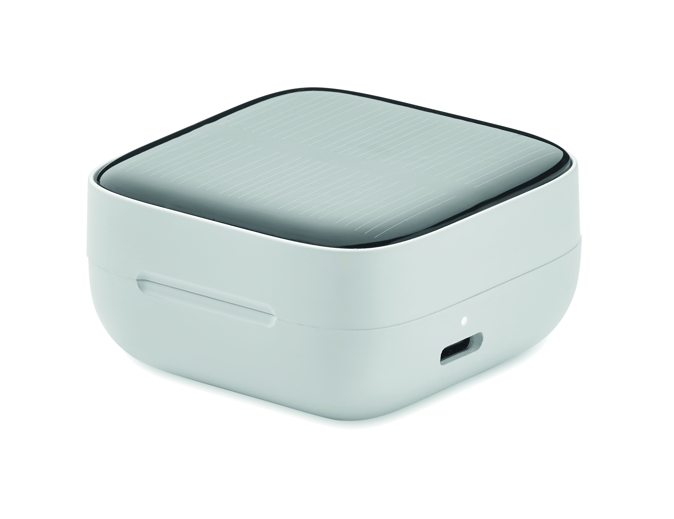 Bezprzewodowe słuchawki douszne ABS True Wireless Stereo (TWS) 5.3 z mikrofonem i akumulatorem 30 mAh. Czas odtwarzania około 4 godzin. Z baterią ładowaną energią słoneczną. Automatyczne parowanie. W zestawie kabel do ładowania typu C i stacja ładująca 200 mAh.