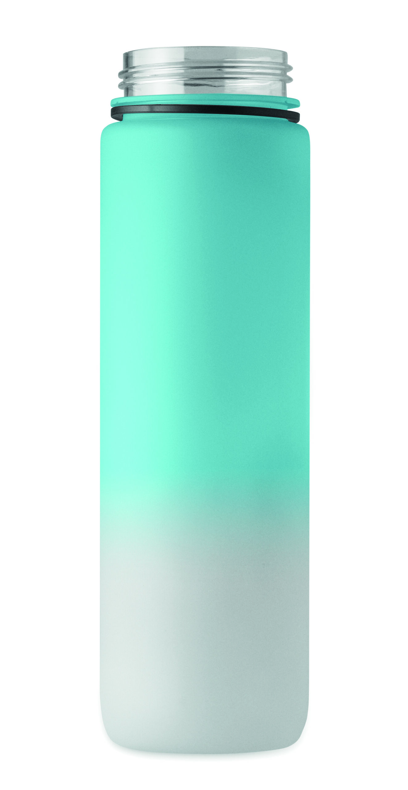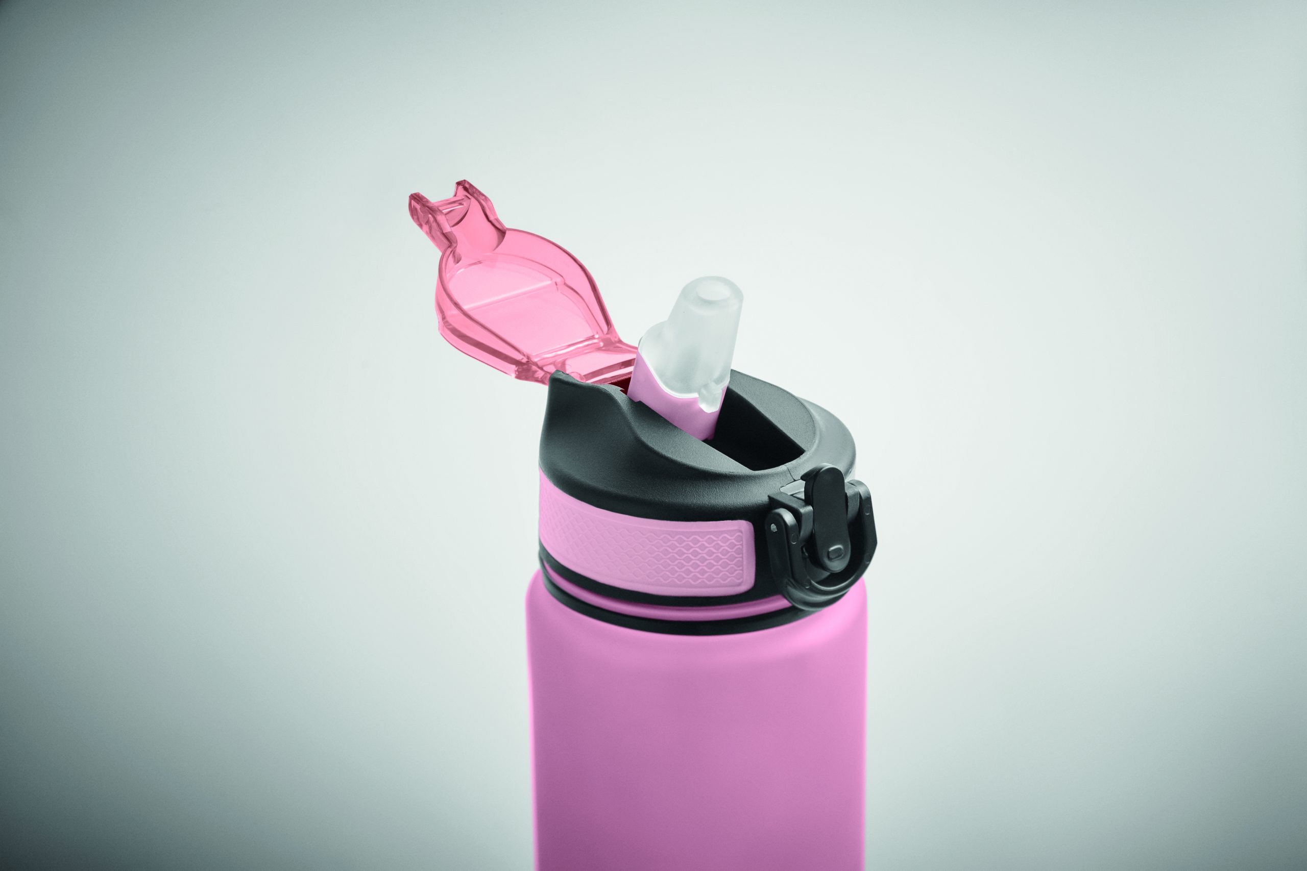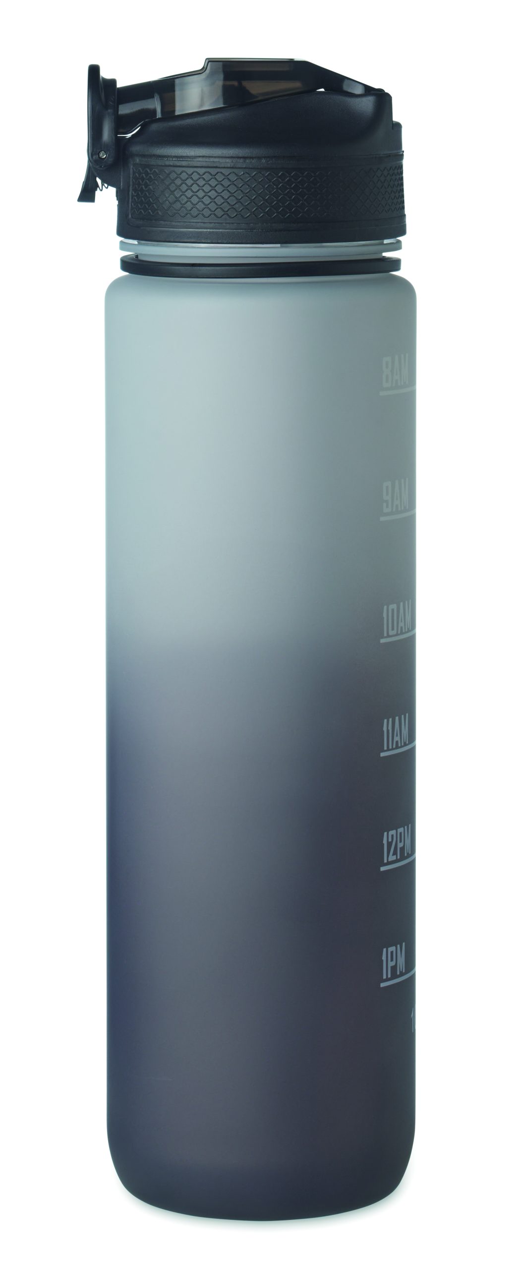 Sportowa butelka na wodę z RPET ze zintegrowaną słomką, miękkim silikonowym ustnikiem, motywacyjnym oznaczeniem czasu, otwieraną jedną ręką klapką, blokadą bezpieczeństwa i paskiem do przenoszenia. Pojemność 1 l. Szczelna.