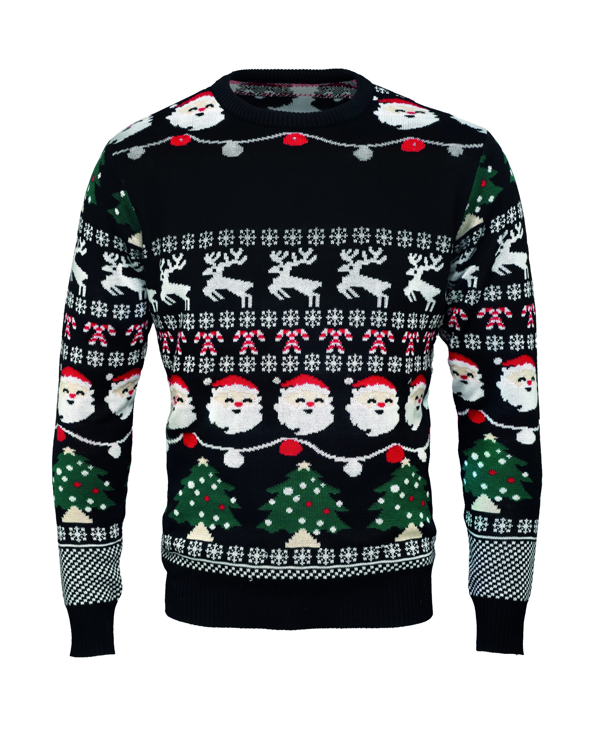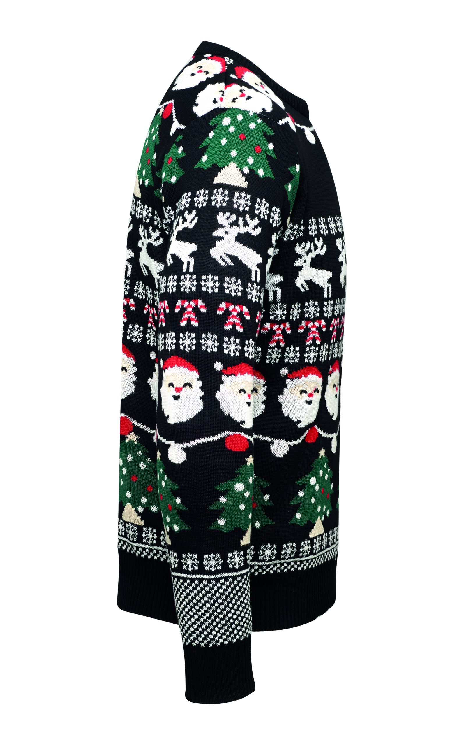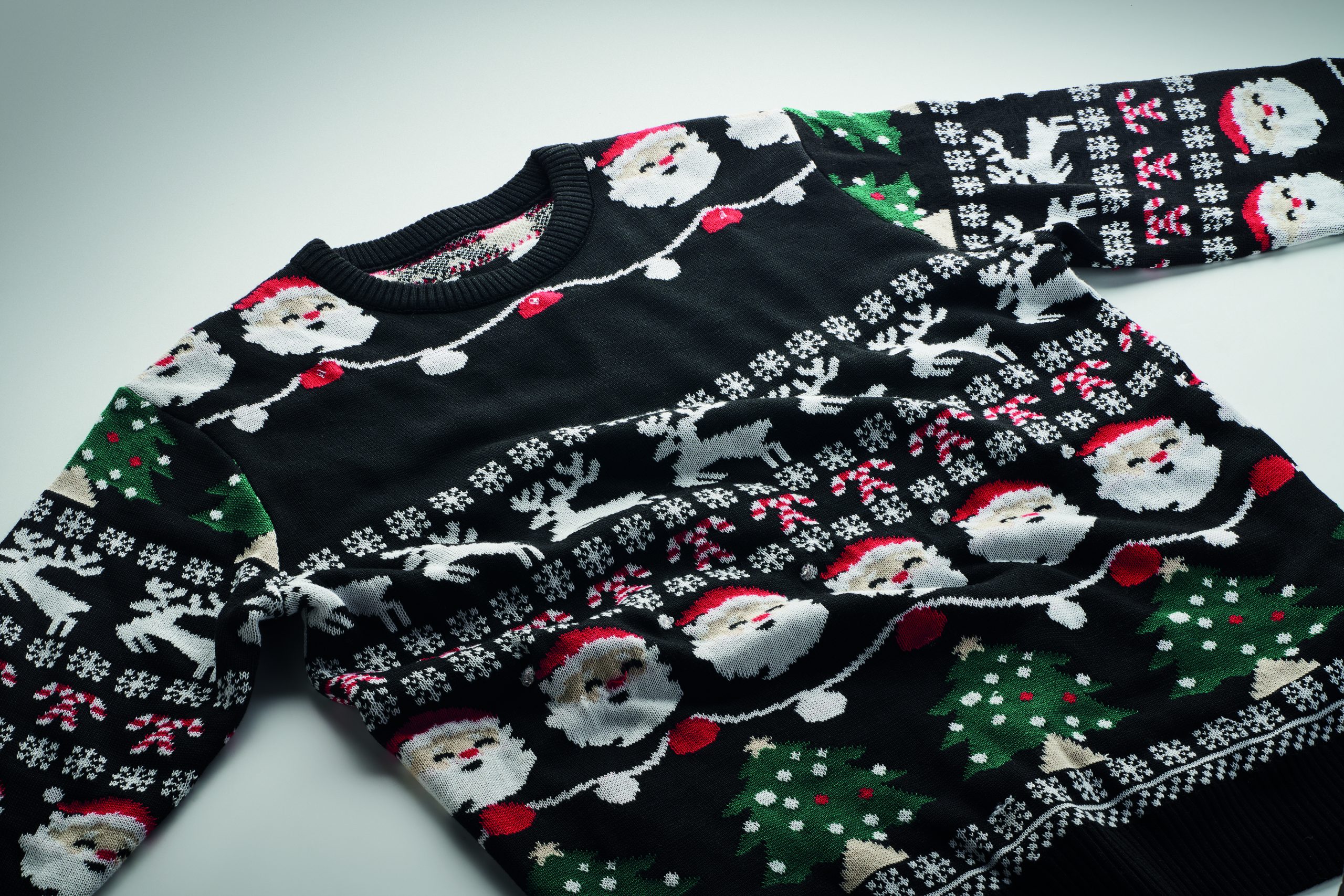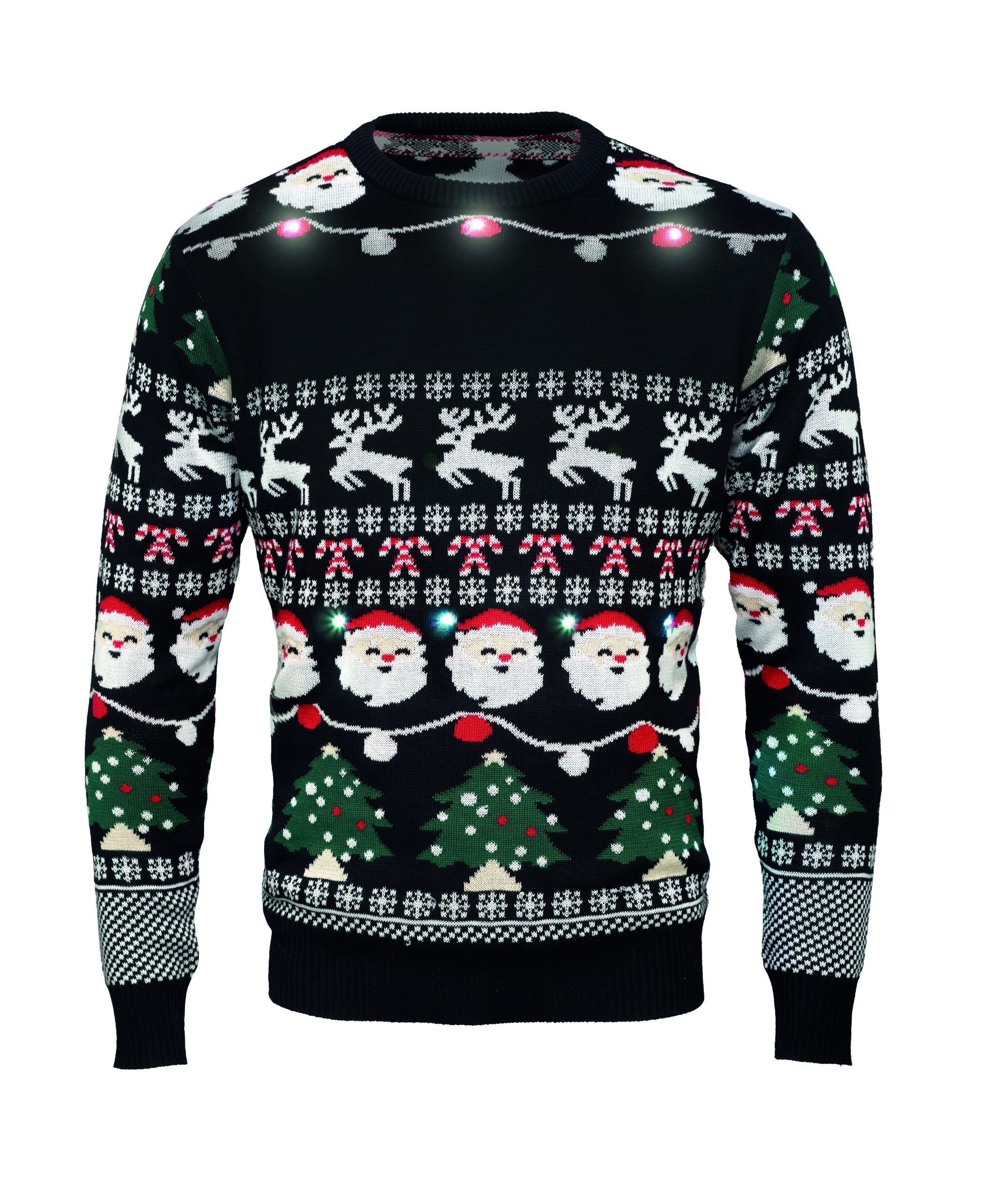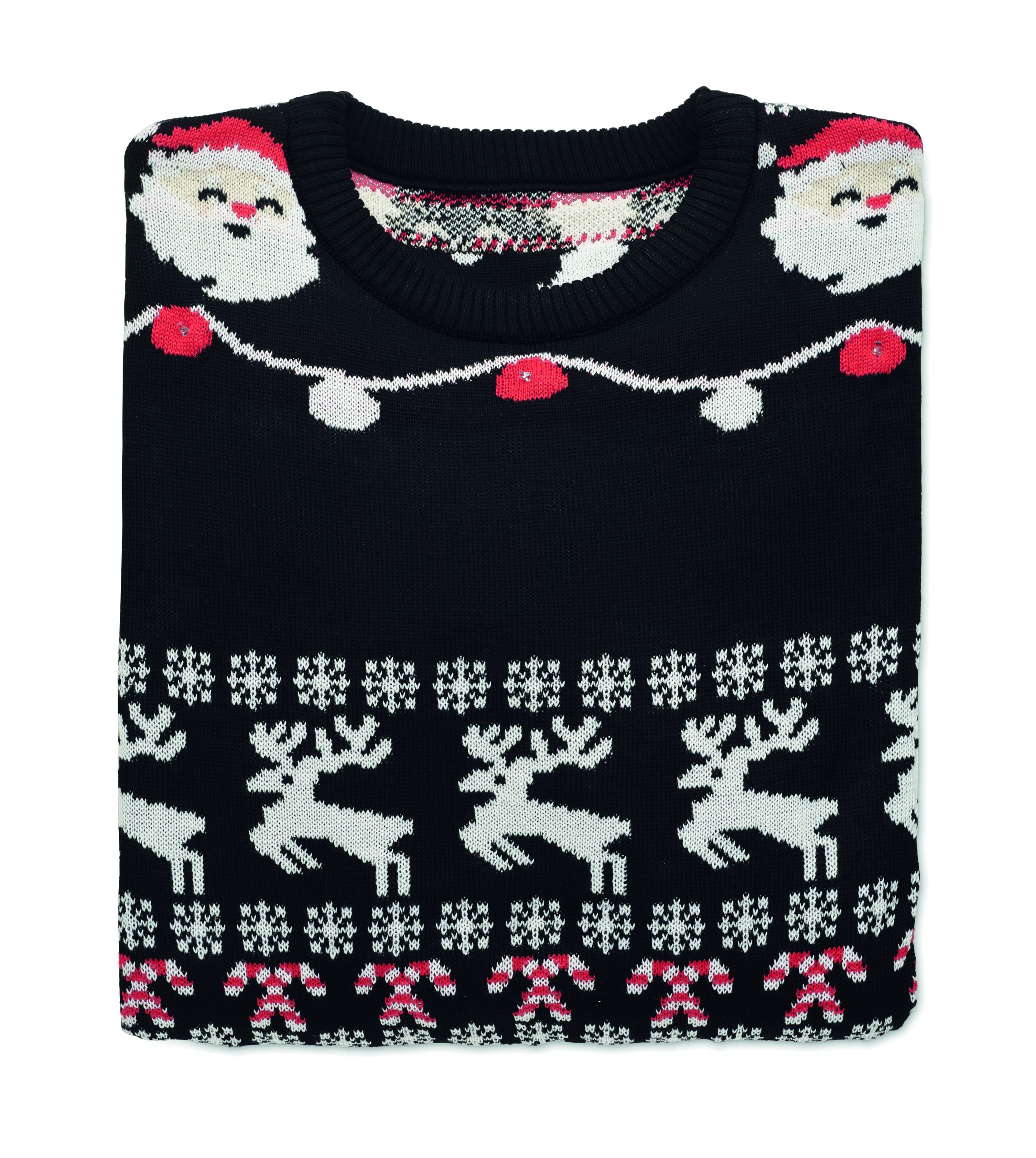Świąteczny sweter z akrylu z 10 światełkami LED. Rozmiar: L/XL. Pokaż się stylowo w pracy lub na rodzinnej kolacji bożonarodzeniowej w tym świątecznym swetrze. Wyjmowana komora na baterie. W zestawie 2 baterie CR2032.
