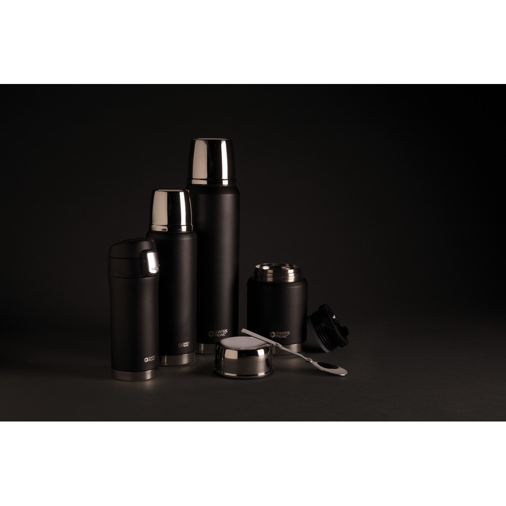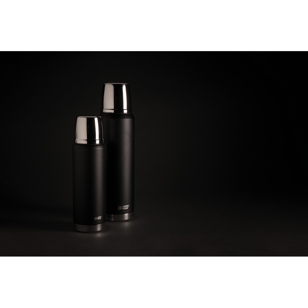 Termos 1000 ml z izolacją próżniową, podwójne ścianki, wnętrze ze stali nierdzewnej 18/8, powlekany proszkowo czarny kolor cechujący się niezwykłą trwałością i odpornością na wyblaknięcie czy popękanie, ściana wewnętrzna pokryta miedzią o wysokim poziomie przewodnictwa, wyłącznie mycie ręczne, utrzymuje temperaturę napojów gorących do 20 godzin oraz zimnych do 24 godzin +leakproof