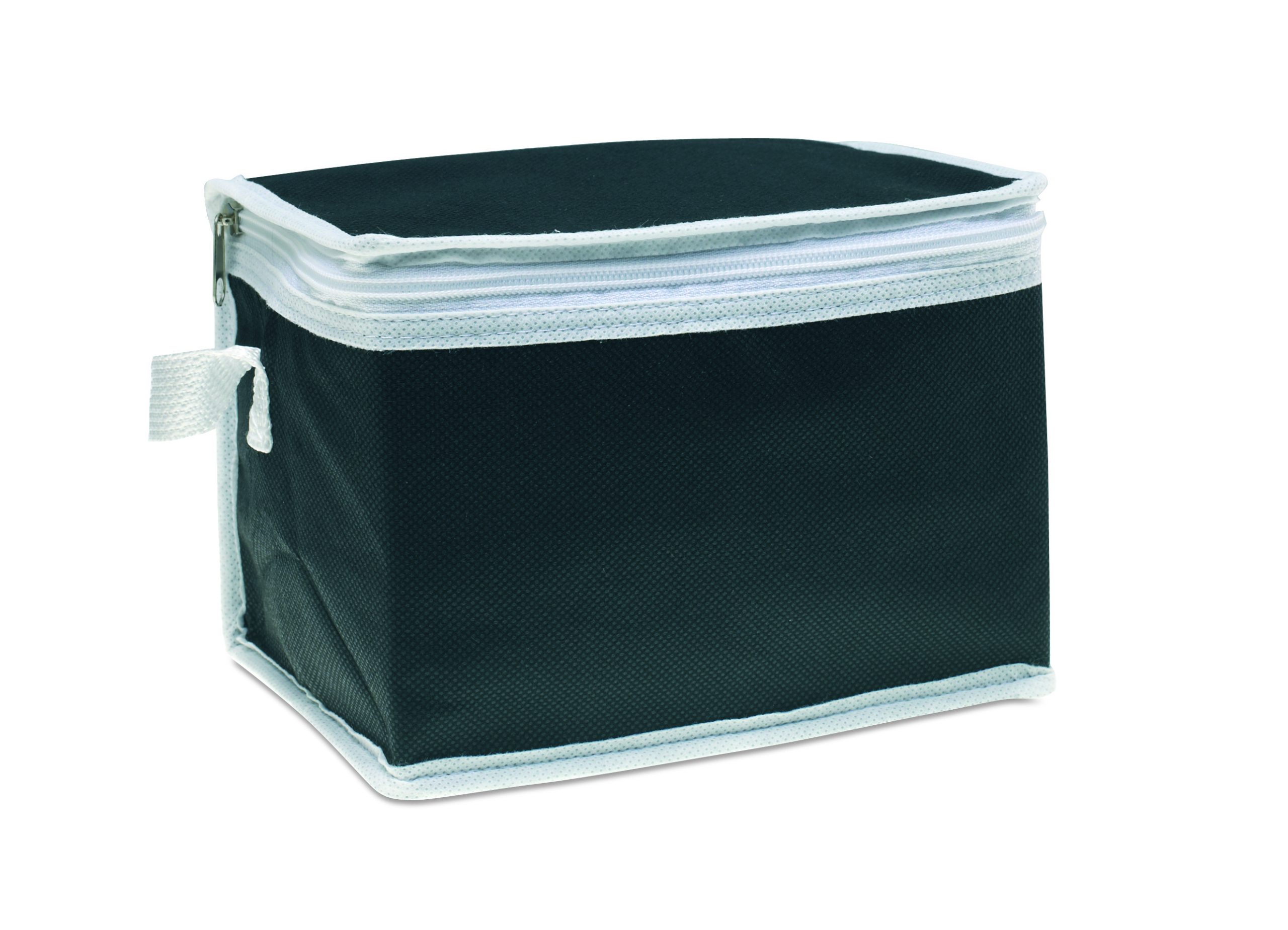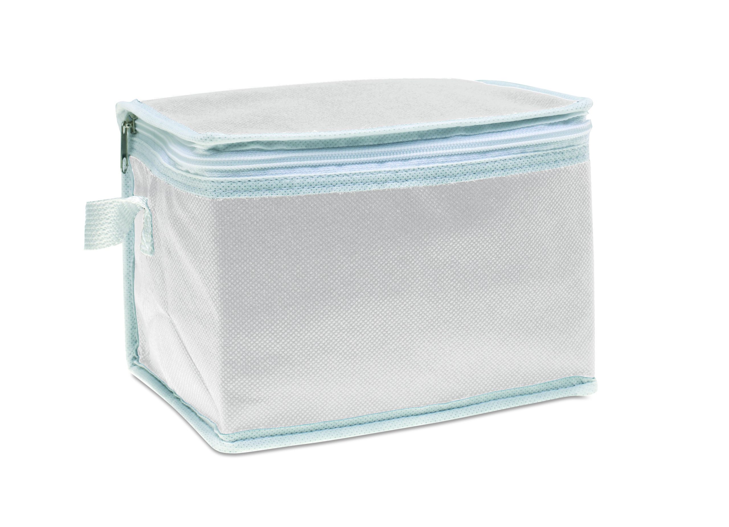 Aluminiowa torba izotermiczna na 6 puszek (330ml). Na zewnątrz materiał non-woven z białą lamówką. 80g/m2. Materiał izolacyjny: Pianka laminowana folią aluminiową. Pojemność 13L.