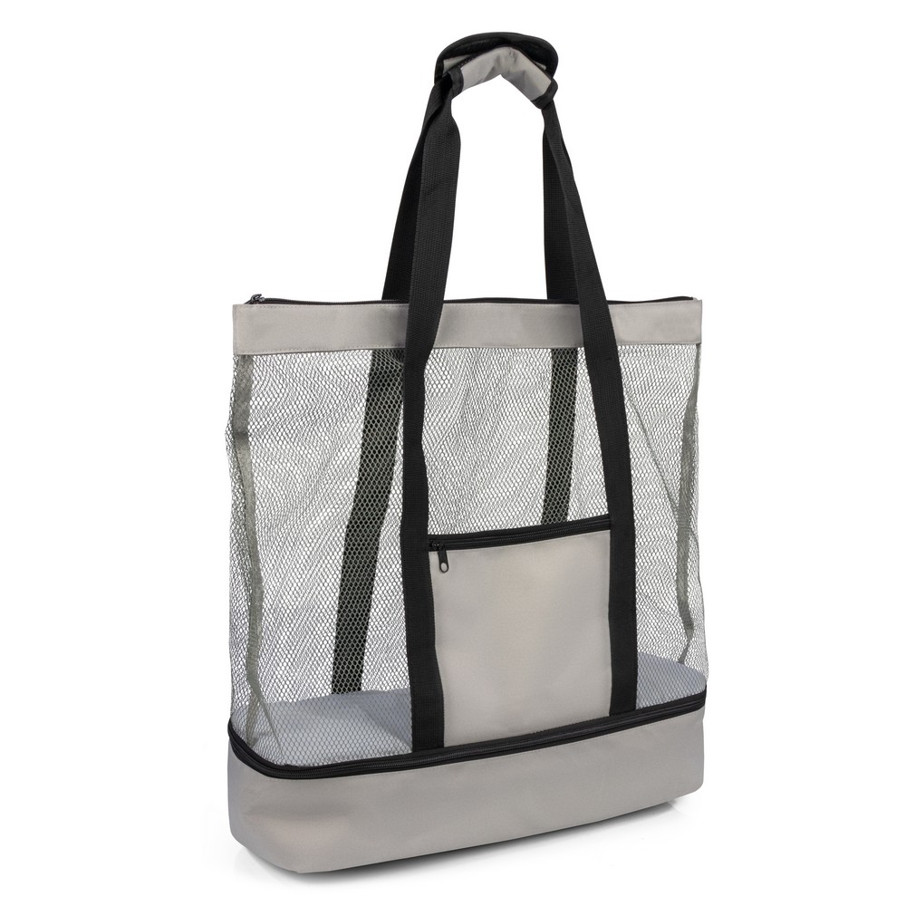 Torba plażowa, na zakupy, wykonana z poliestru RPET, zgodna z certyfikatem GRS (Global RecycIed Standard), z dolną przegrodą termoizolacyjną na zamek błyskawiczny, przednia kieszeń i siateczkowa przegroda główna na zamek błyskawiczny
