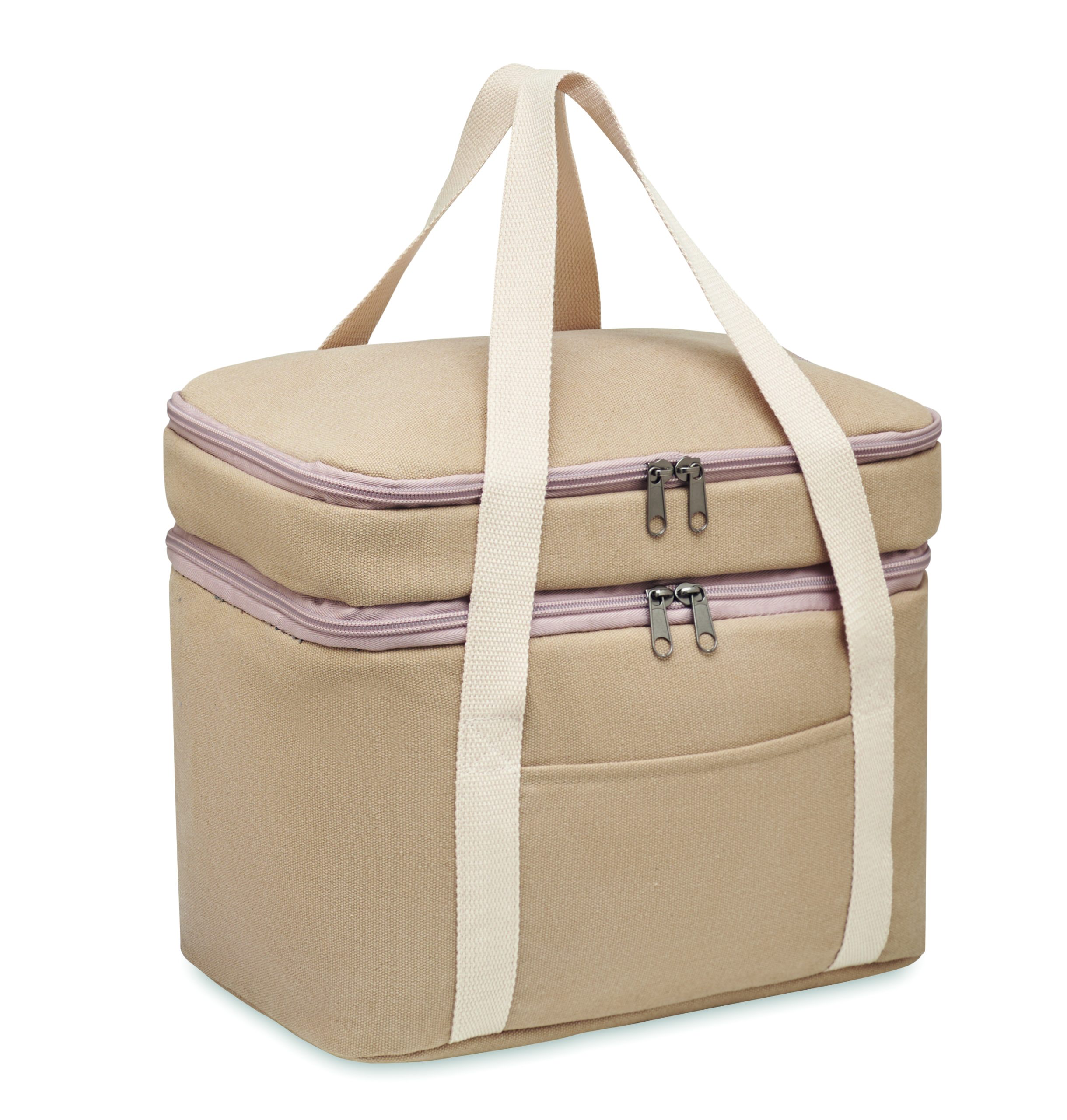 Torba termiczna z 2 przegrodami wykonana z płótna canvas z bawełnianym paskiem. 320 gr/m². Izolacja: 15C PEVA z 6mm pianką PE.