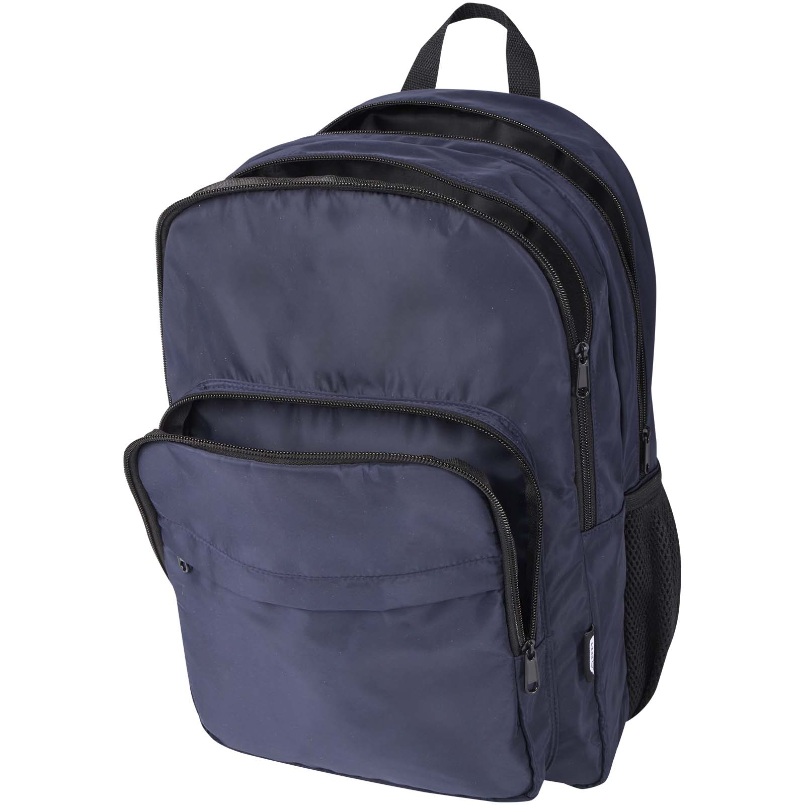 Plecak Trend Plus został wykonany z miękkiego i odpornego na zagniecenia materiału pochodzącego z recyklingu z certyfikatem GRS i ma wysokiej jakości podszewkę RPET. Plecak posiada przegrodę na laptopa 15”, przegrodę organizacyjną, kieszenie z przodu zapinane na zamek, boczne kieszenie z elastycznej siatki oraz tylną część z siateczki z paskiem do przymocowania do wózka. Regulowane paski na ramiona zapewniają optymalny komfort noszenia. Pojemność: 20 litrów. Wytrzymałość do 10 kg. Wolne od PVC.