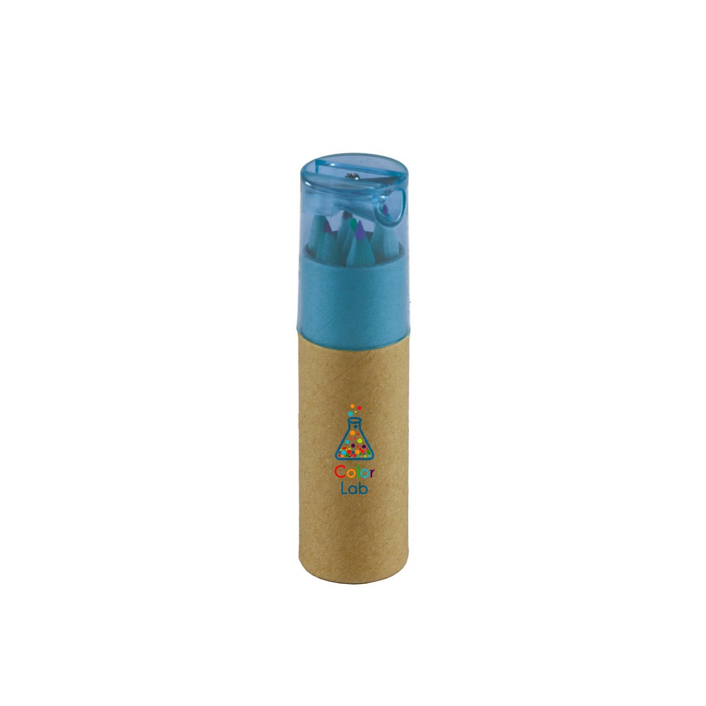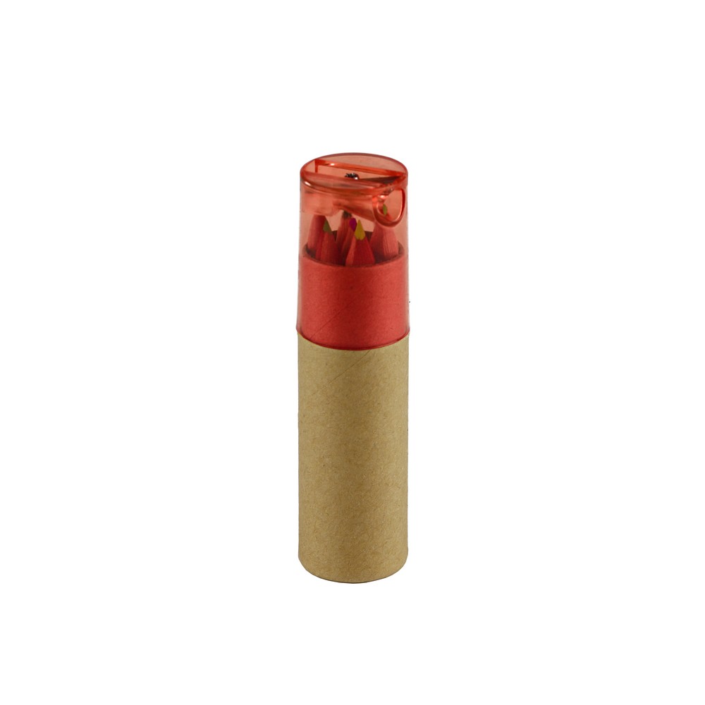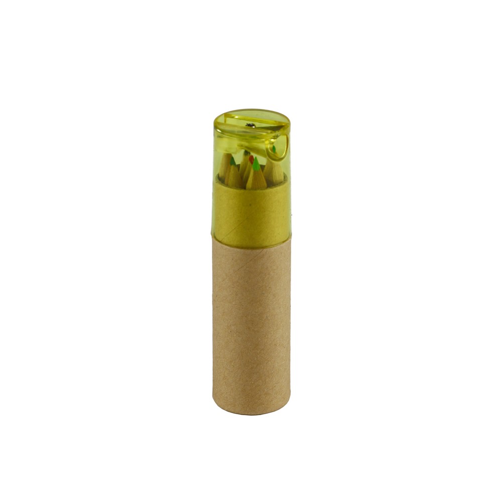 Zestaw 6 kredek w okrągłym pudełku zamykanym kolorową zatyczką z wbudowaną temperówką, produkt wykonany z kartonu z recyklingu