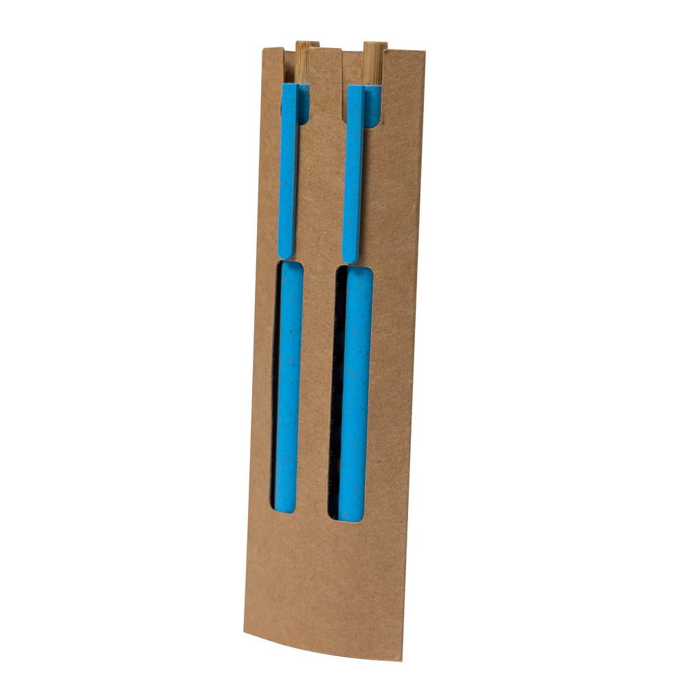 Zestaw piśmienniczy w etui z kartonu z recyklingu, długopis i „wieczny” ołówek ze specjalną wolnościerającą się końcówką, wkład długopisu w niebieskim kolorze, posiadają bambusowe przyciski, produkt wykonany ze słomy pszenicznej, ABS i bambusa