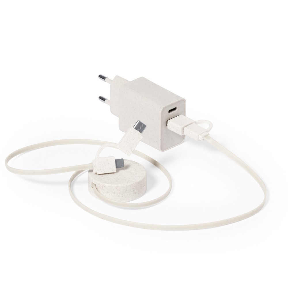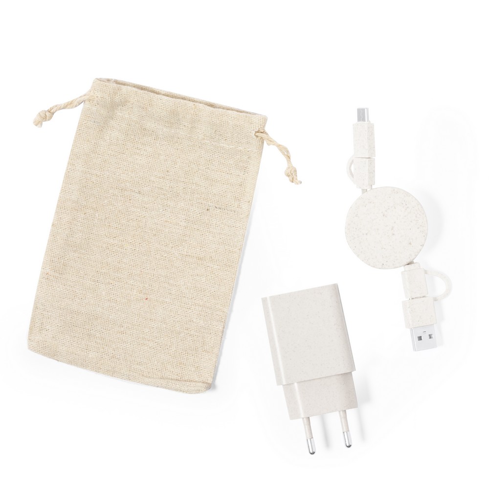 Zestaw podróżny do ładowania z włókien słomy pszenicznej, zwijany kabel do ładowania i synchronizacji z 4 końcówkami: USB, micro USB, USB typu C oraz końcówką kompatybilną z urządzeniami iOS, ładowarka ścienna z portem USB oraz USB typu C, bawełniany pokrowiec w komplecie