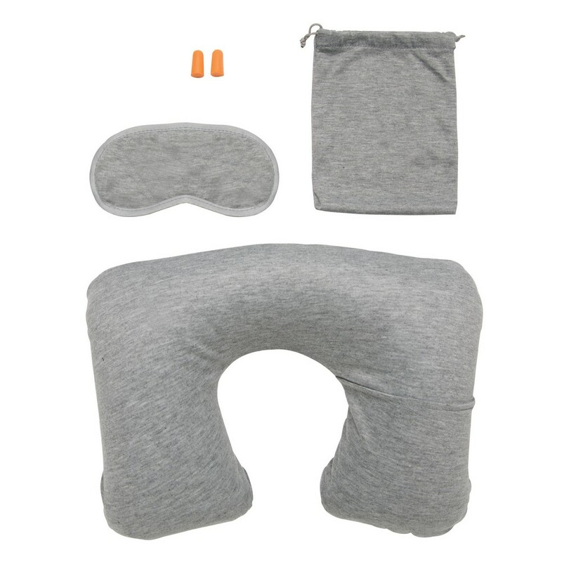 Zestaw akcesoriów podróżnych, miękkie zatyczki do uszu, maska na oczy, dmuchany zagłówek, posiada kieszeń na telefon lub słuchawki, pokrowiec ze ściągaczami w komplecie, ślad węglowy produktu: 1,89 kg CO2