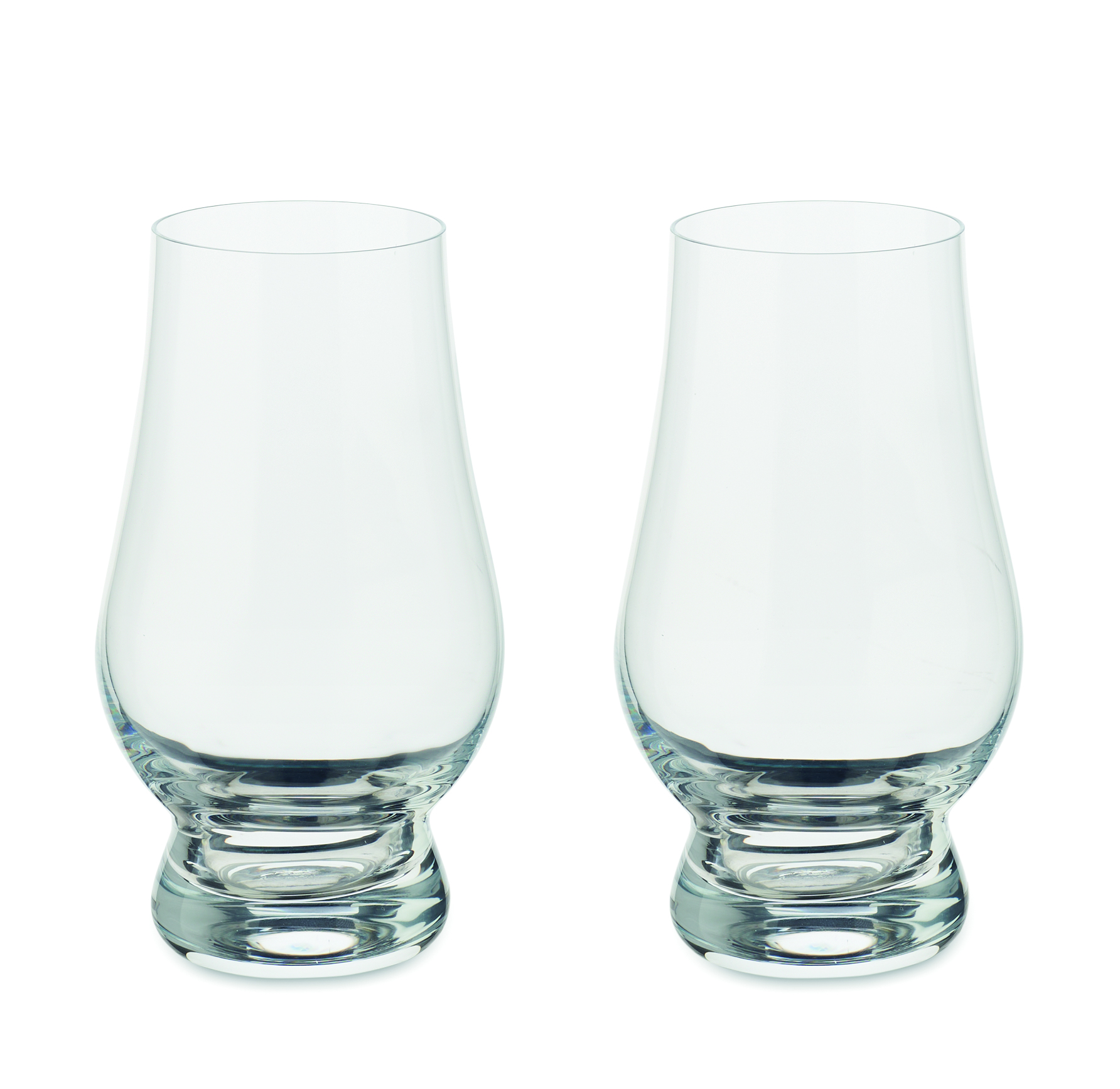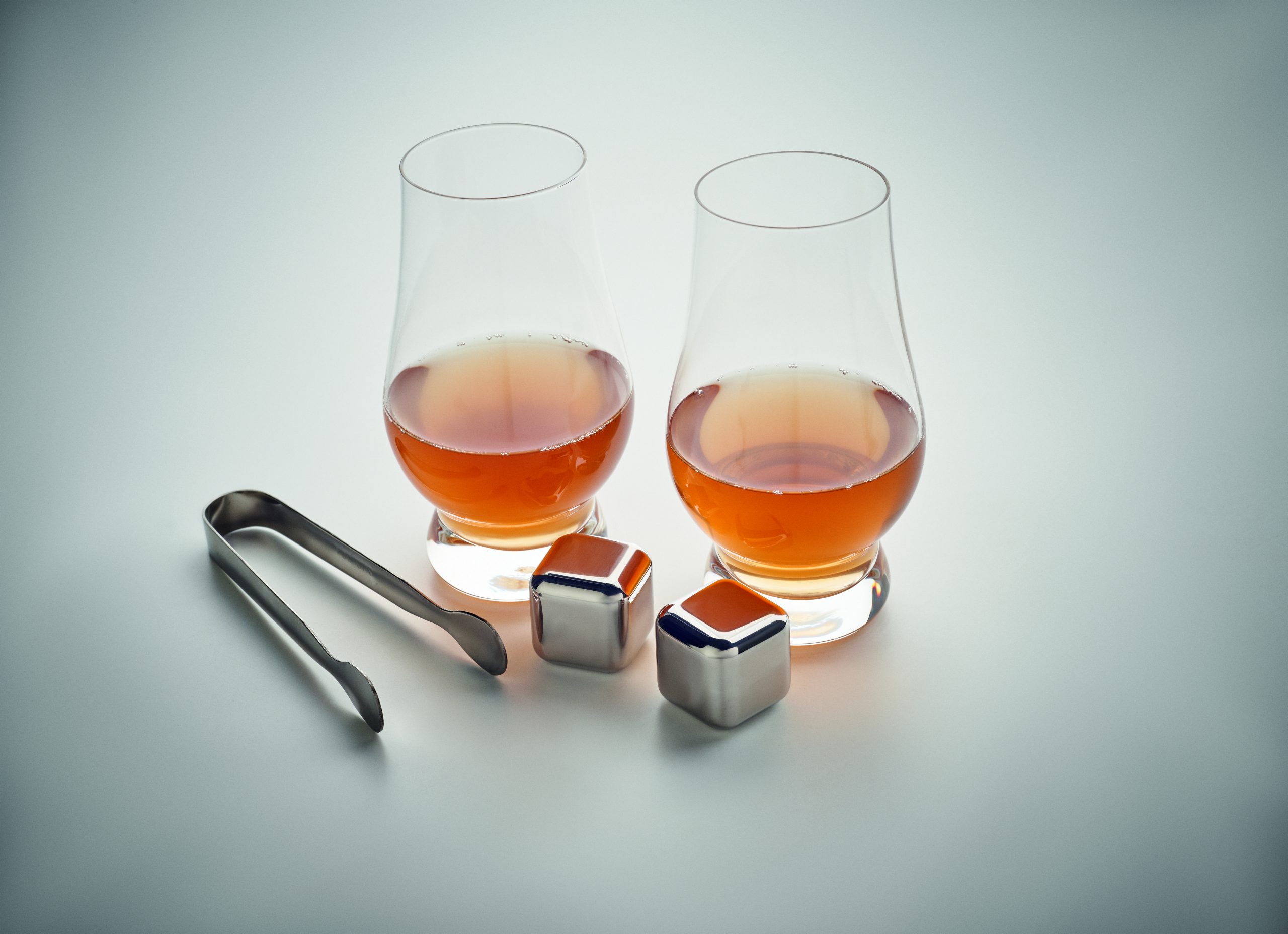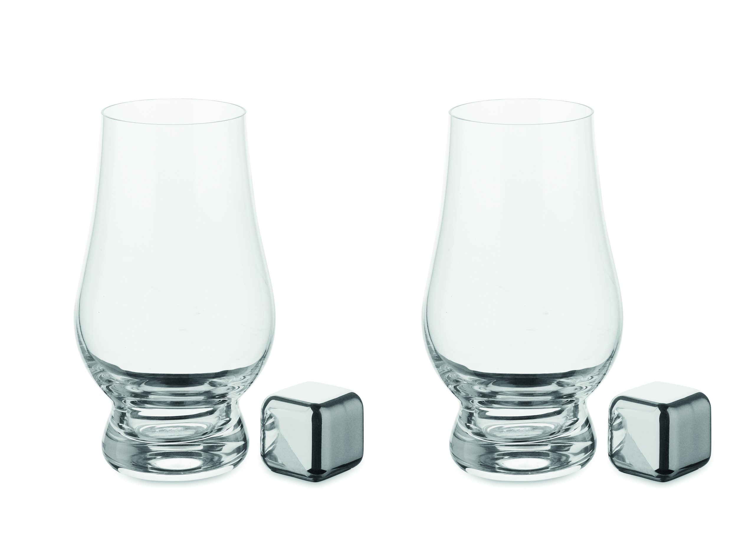 Zestaw 2 szklanek degustacyjnych (200 ml) do whisky lub innych trunków, 2 kostki wielokrotnego użytku ze stali nierdzewnej, szczypce i bawełniany woreczek do przechowywania kostek.