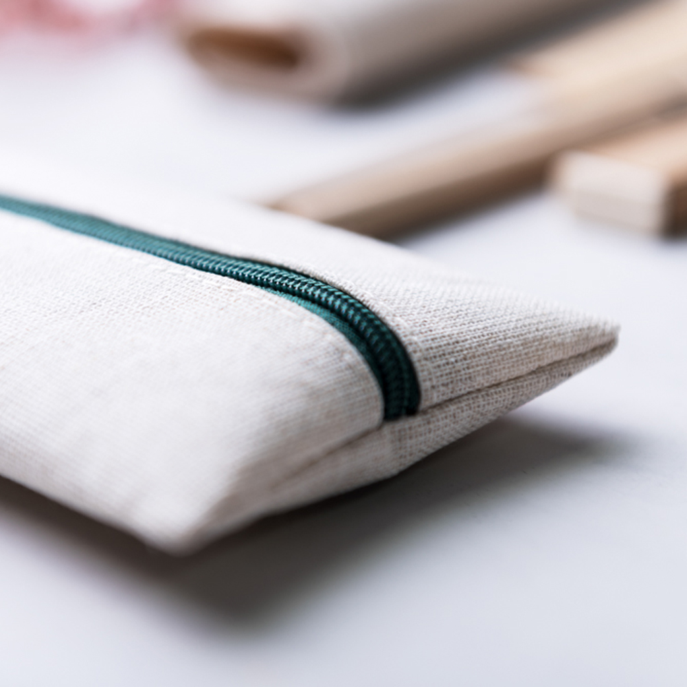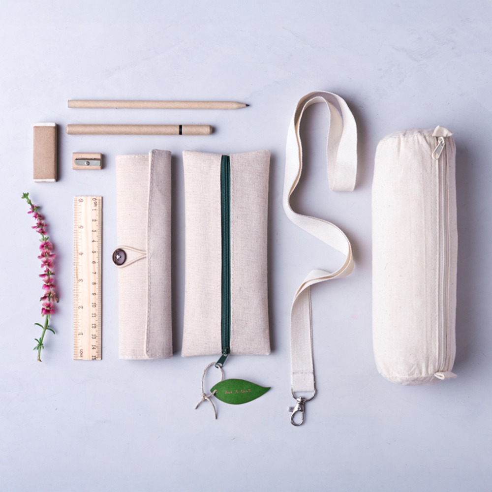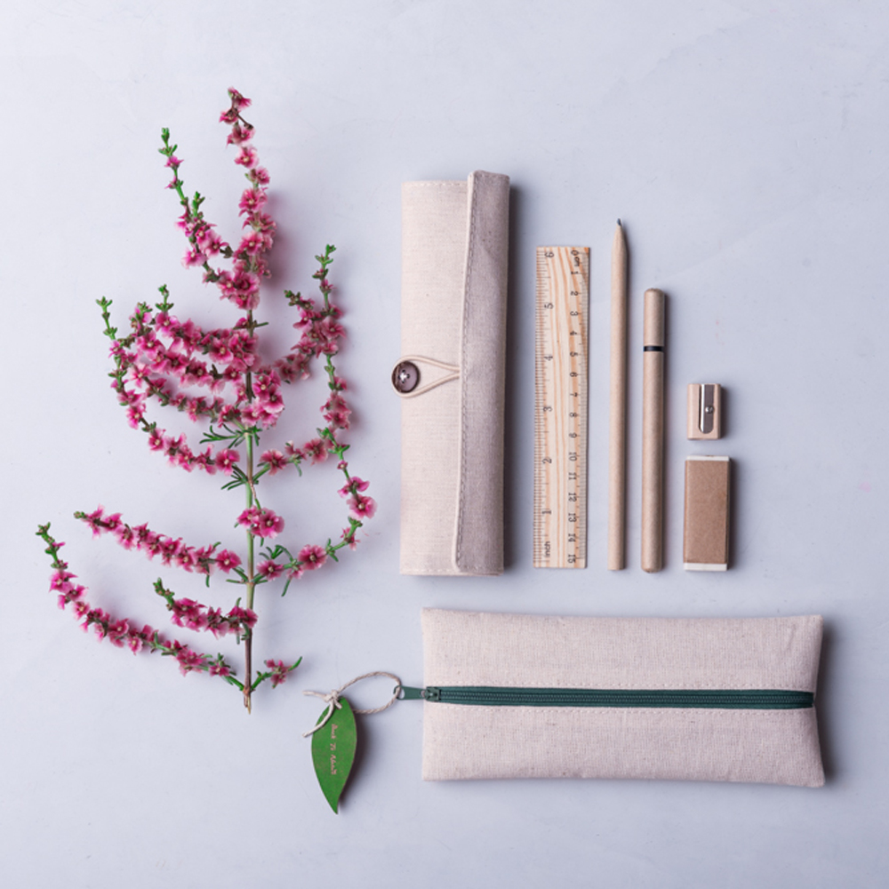 Zestaw szkolny w piórniku zamykanym na zamek błyskawiczny, w komplecie znajduje się: ołówek (nienaostrzony), długopis z wkładem w niebieskim kolorze, linijka (15 cm / 6 cali), gumka oraz temperówka, produkt wykonany między innymi z bawełny i drewna