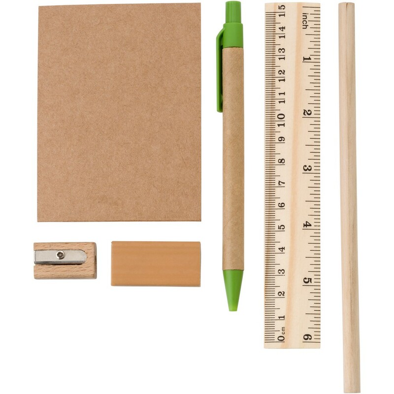Zestaw szkolny w piórniku na zamek błyskawiczny, linijka, długopis z zielonymi elementami, ołówek, temperówka, gumka i notes