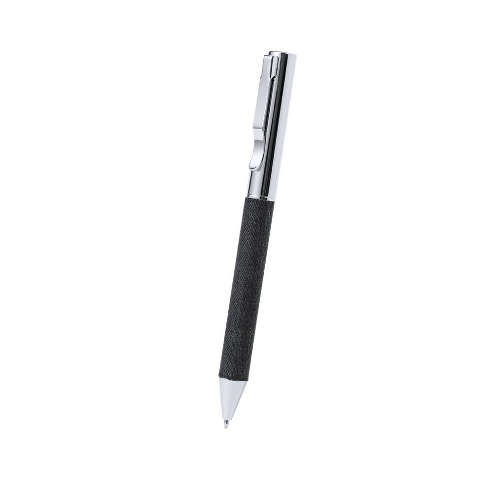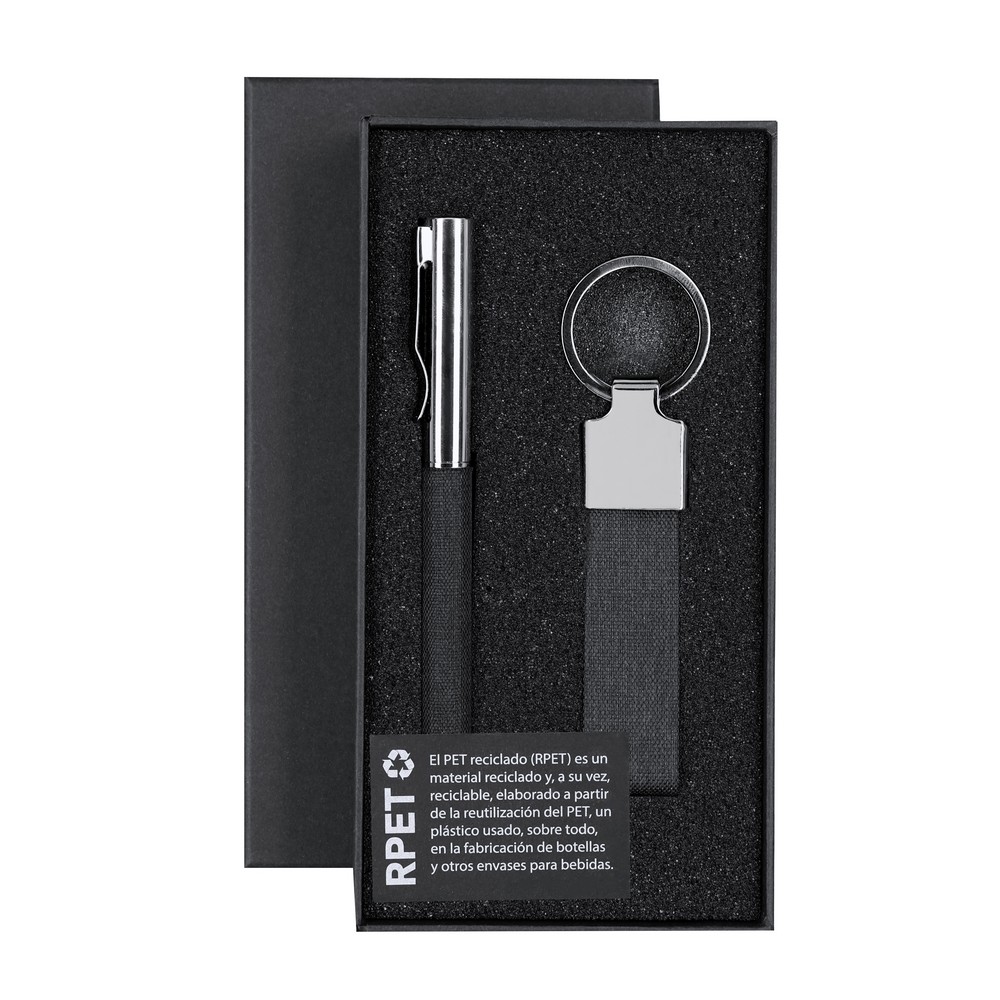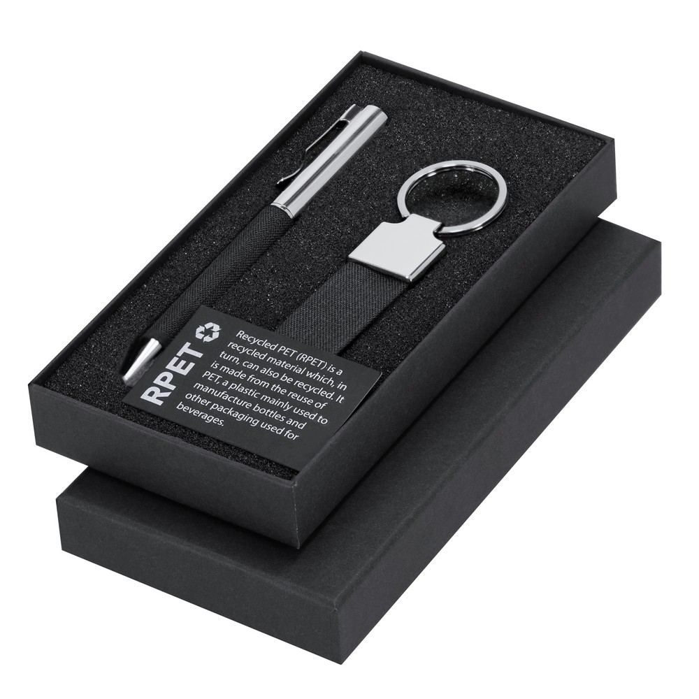Zestaw upominkowy, w zestawie brelok, długopis posiada wkład w niebieskim kolorze, czarne pudełko podarunkowe w komplecie, produkt wykonany z poliestru RPET oraz metalu