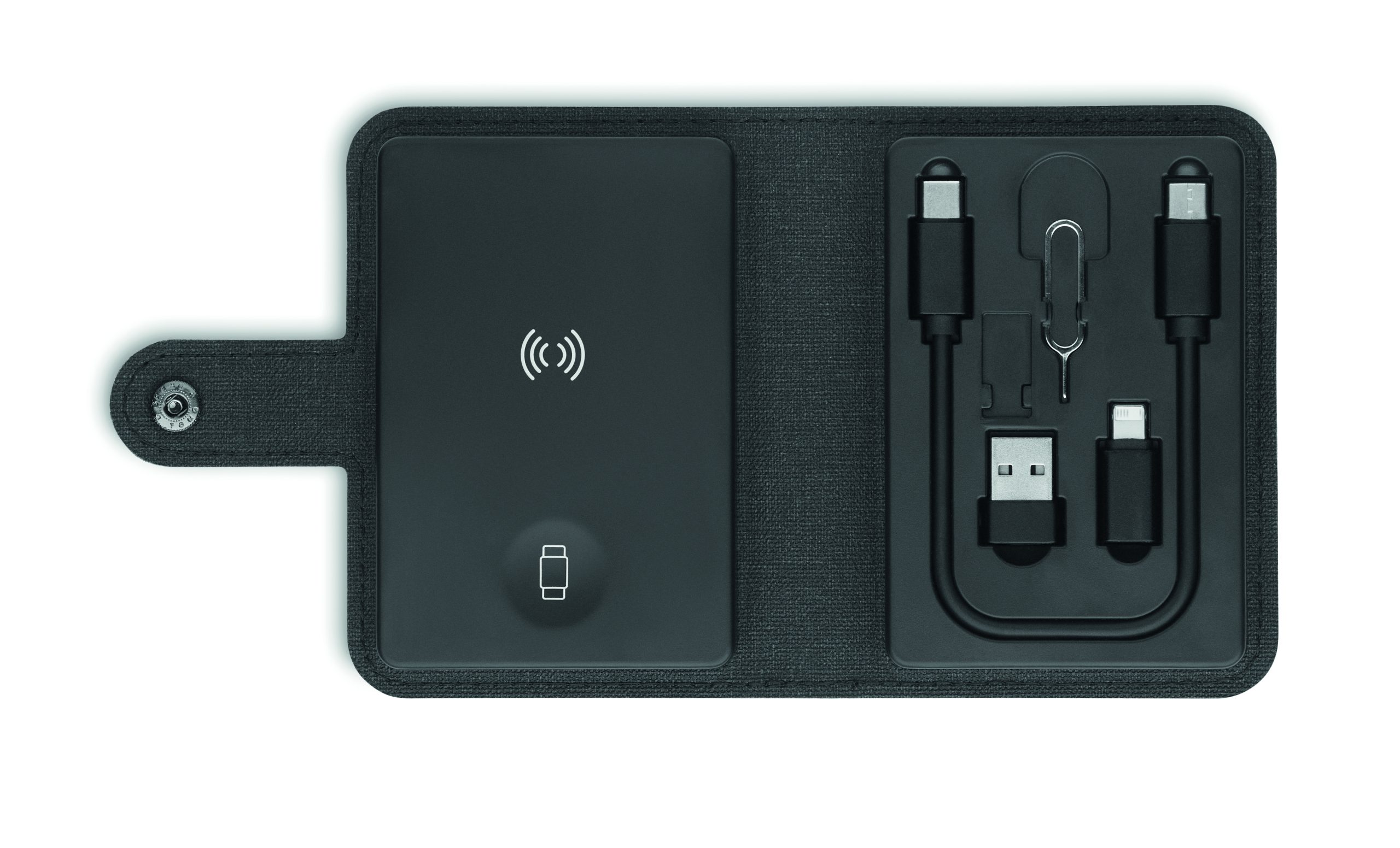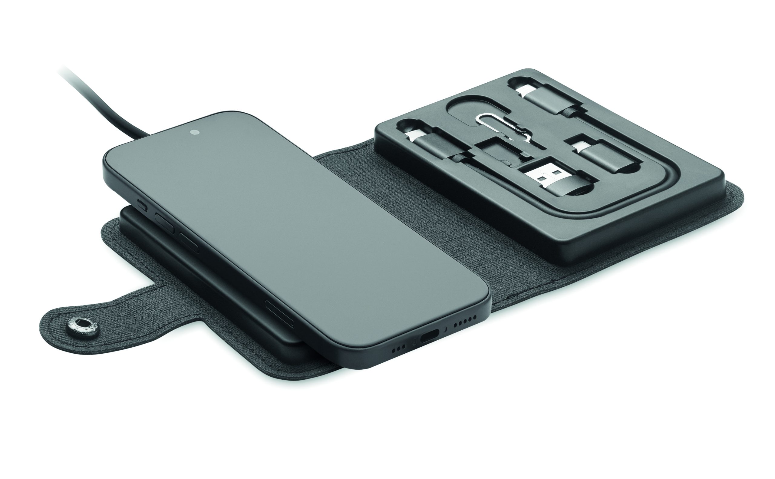 Zestaw kabli z ładowarką bezprzewodową 15W i ładowarką do zegarka (tylko Apple®). Kabel ładujący 4 w 1 z narzędziem do wysuwania kart. Pokrywa z PU + RPET pochodzącego z recyklingu, plastik ABS pochodzący z recyklingu i aluminiowa płyta pochodząca z recyklingu.