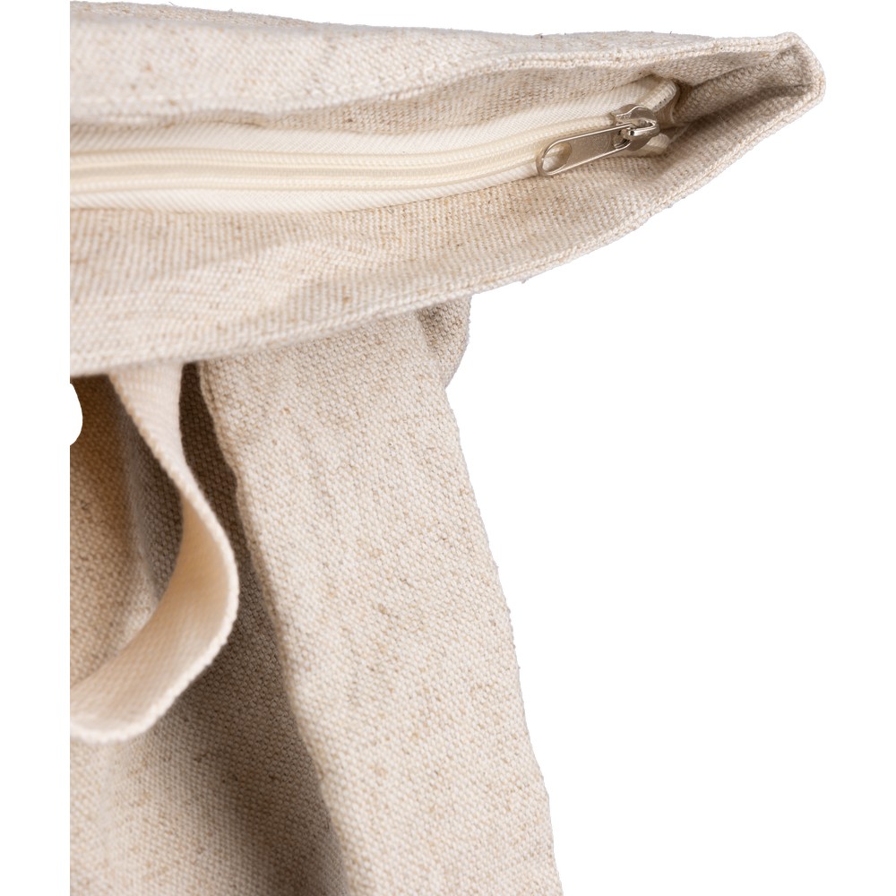 Zwijany plecak, z bawełnianą podszewką, przednia kieszeń zamykana na zamek, rozwijalna główna kieszeń, która umożliwia zwiększanie pojemności plecaka, ikona konopi na produkcie, produkt wykonany z konopi i PEVA